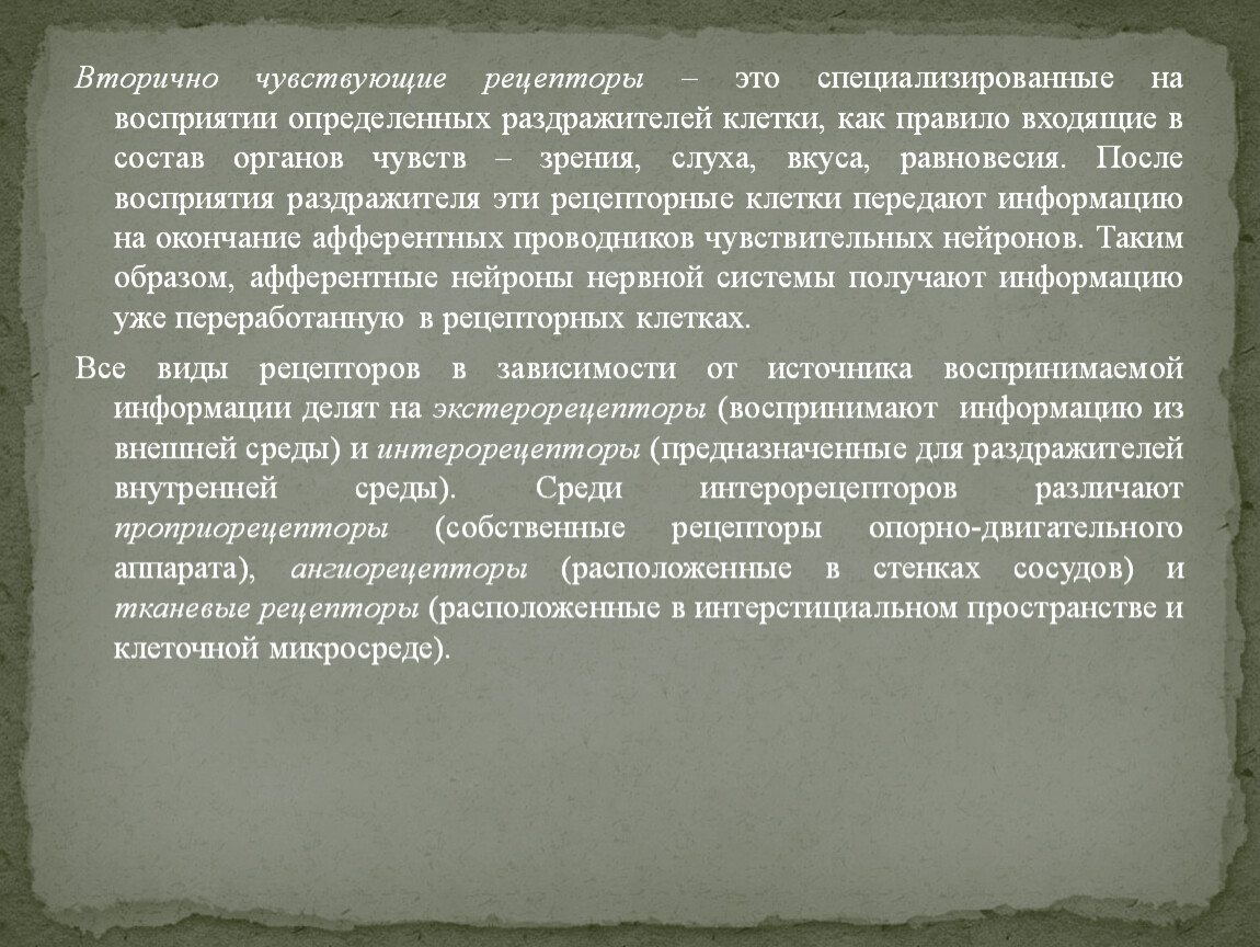 Вторично чувствующие рецепторы – это специализированные на восприятии определенных раздражителей клетки, как правило входящие в состав органов чувств – зрения, слуха, вкуса, равновесия. После восприятия раздражителя эти рецепторные клетки передают информацию на окончание афферентных проводников чувствительных нейронов. Таким образом, афферентные нейроны нервной системы получают информацию уже переработанную в рецепторных клетках.