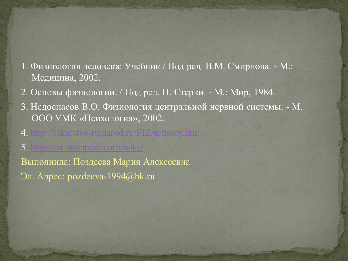1. Физиология человека: Учебник / Под ред. В.М. Смирнова. - М.: Медицина, 2002.