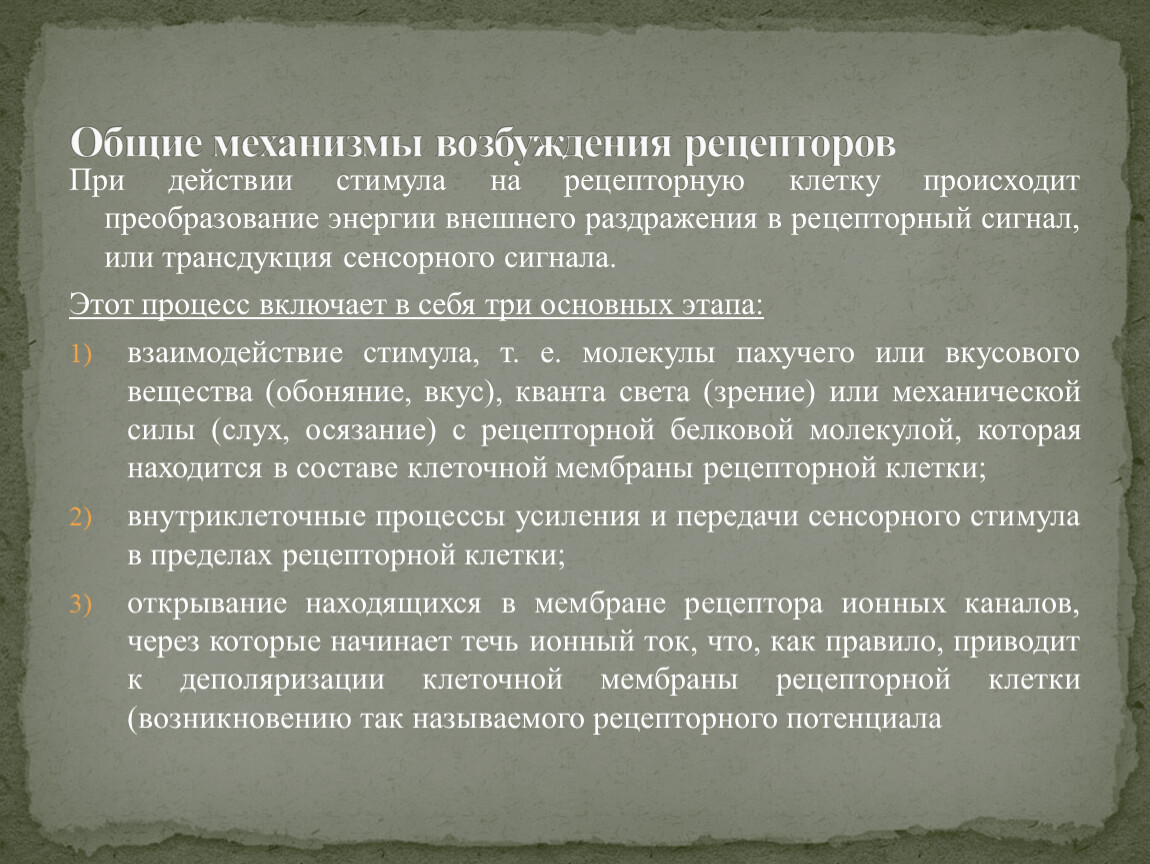 При действии стимула на рецепторную клетку происходит преобразование энергии внешнего раздражения в рецепторный сигнал, или трансдукция сенсорного сигнала.