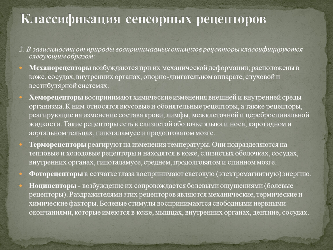 2. В зависимости от природы воспринимаемых стимулов рецепторы классифицируются следующим образом: