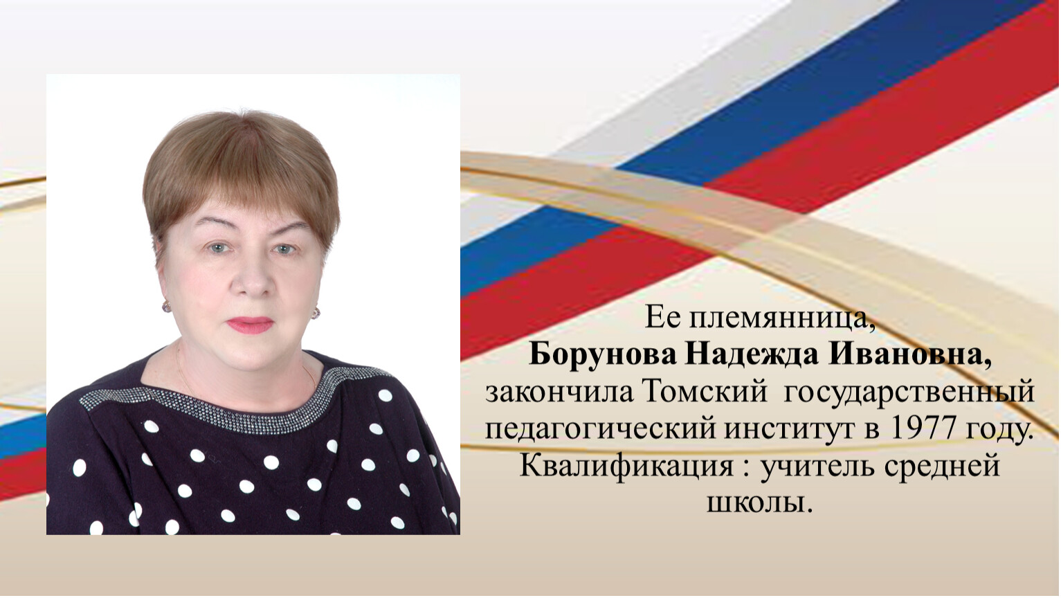Ее племянница, Борунова Надежда Ивановна, закончила Томский государственный педагогический институт в 1977 году.Квалификация : учитель средней школы.