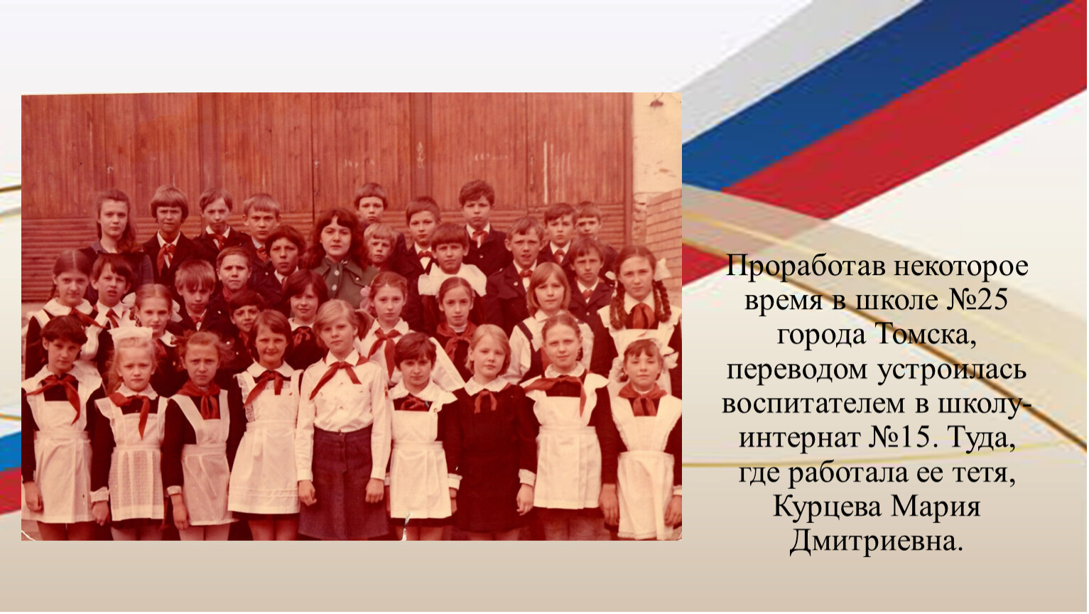 Проработав некоторое время в школе №25 города Томска, переводом устроилась воспитателем в школу- интернат №15. Туда, где работала ее тетя, Курцева Мария Дмитриевна.