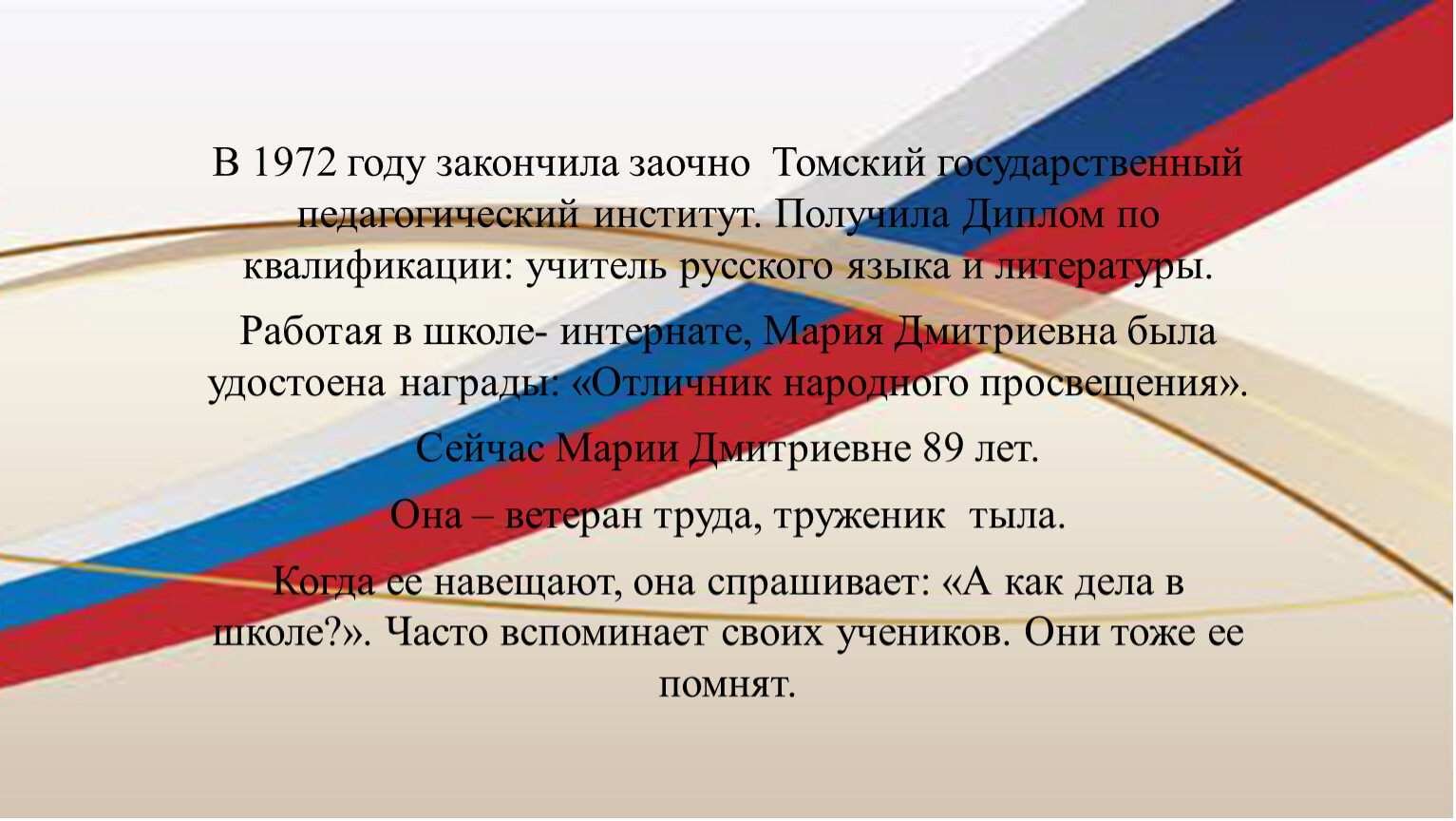 Работая в школе- интернате, Мария Дмитриевна была удостоена награды: «Отличник народного просвещения».