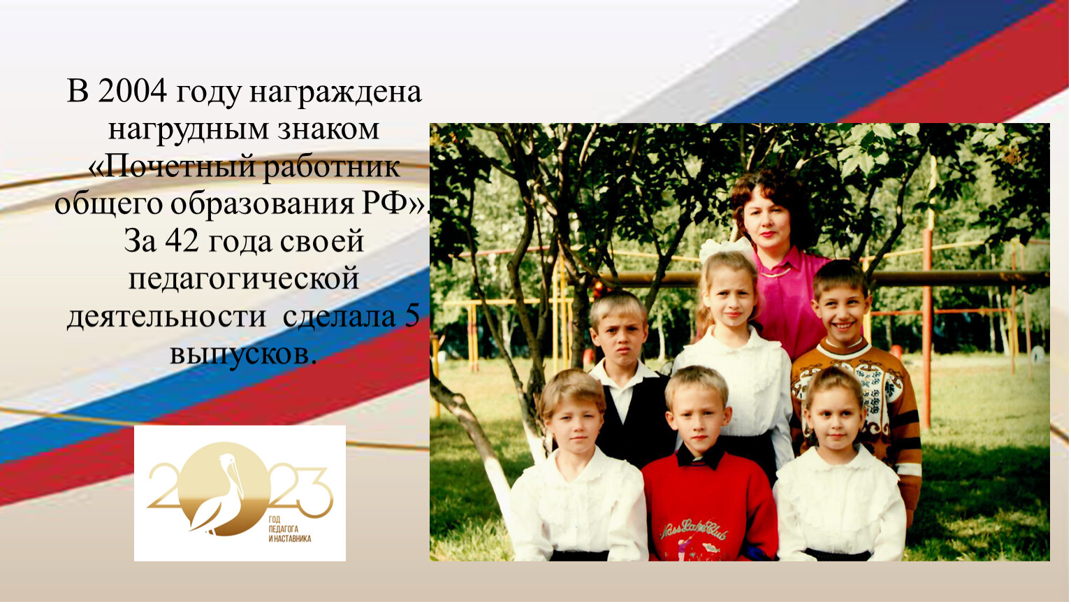 В 2004 году награждена нагрудным знаком «Почетный работник общего образования РФ». За 42 года своей педагогической деятельности сделала 5 выпусков.