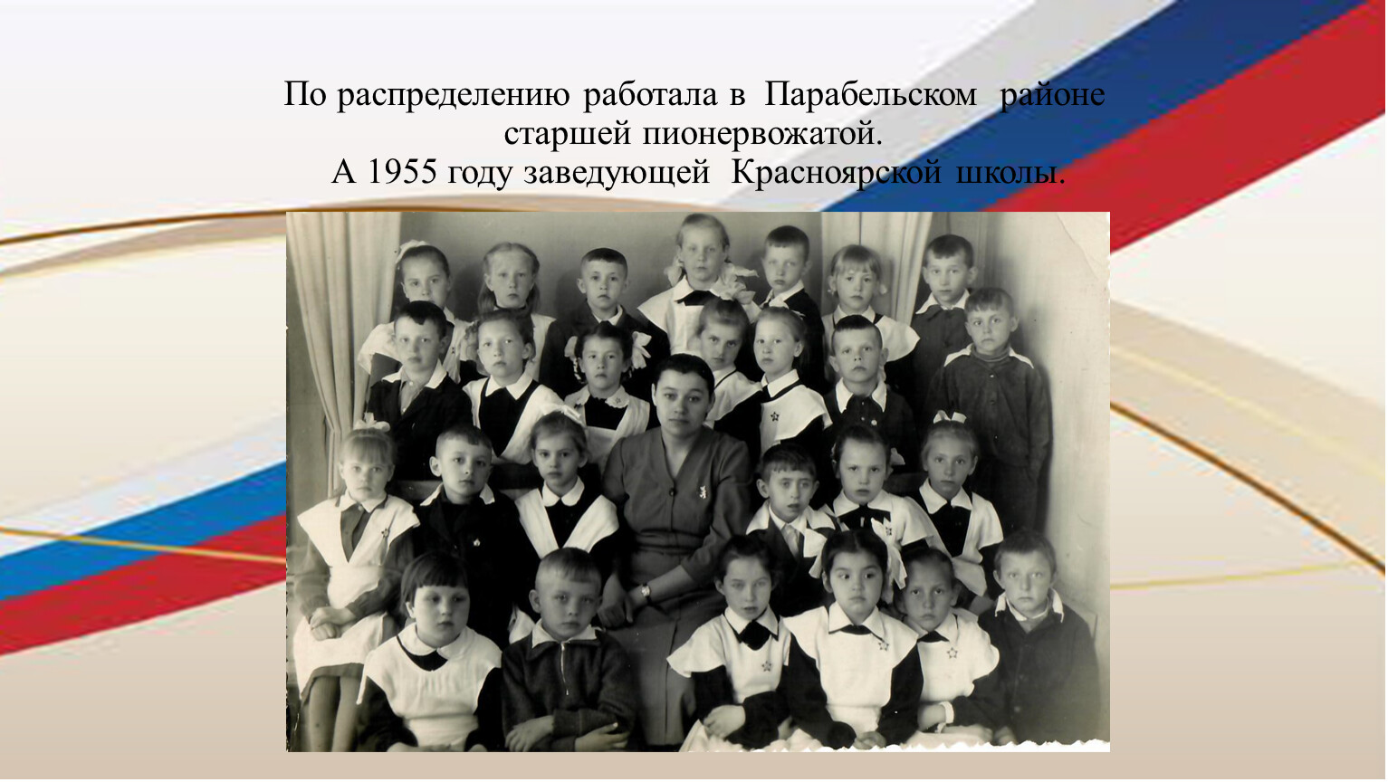 По распределению работала в Парабельском районестаршей пионервожатой. А 1955 году заведующей Красноярской школы.