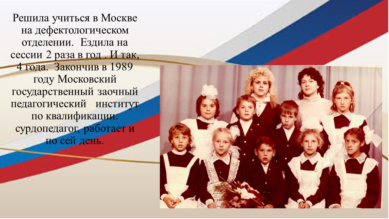 Решила учиться в Москве на дефектологическом отделении. Ездила на сессии 2 раза в год . И так, 4 года. Закончив в 1989 году Московский государственный заочный педагогический институт по квалификации: сурдопедагог, работает и по сей день.