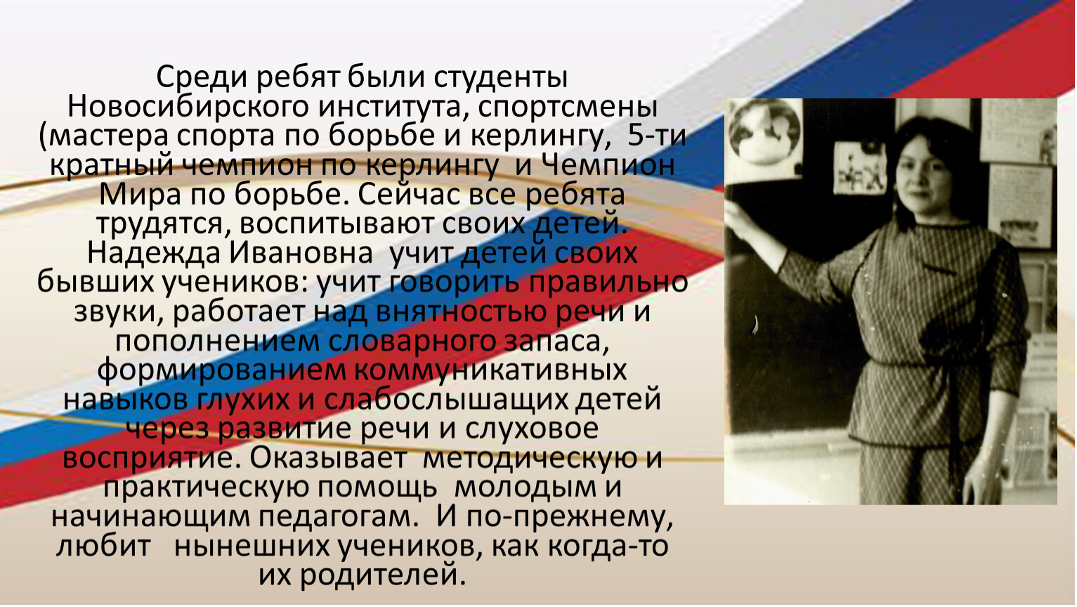 Среди ребят были студенты Новосибирского института, спортсмены (мастера спорта по борьбе и керлингу, 5-ти кратный чемпион по керлингу и Чемпион Мира по борьбе. Сейчас все ребята трудятся, воспитывают своих детей. Надежда Ивановна учит детей своих бывших учеников: учит говорить правильно звуки, работает над внятностью речи и пополнением словарного запаса, формированием коммуникативных навыков глухих и слабослышащих детей через развитие речи и слуховое восприятие. Оказывает методическую и практическую помощь молодым и начинающим педагогам. И по-прежнему, любит нынешних учеников, как когда-то их родителей.