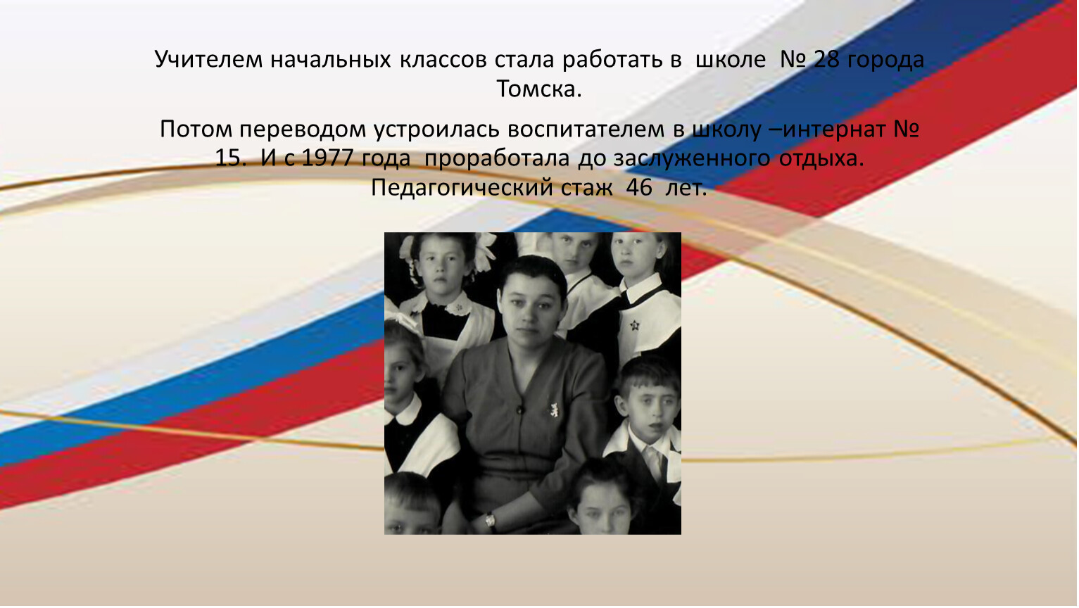 Учителем начальных классов стала работать в школе № 28 города Томска.