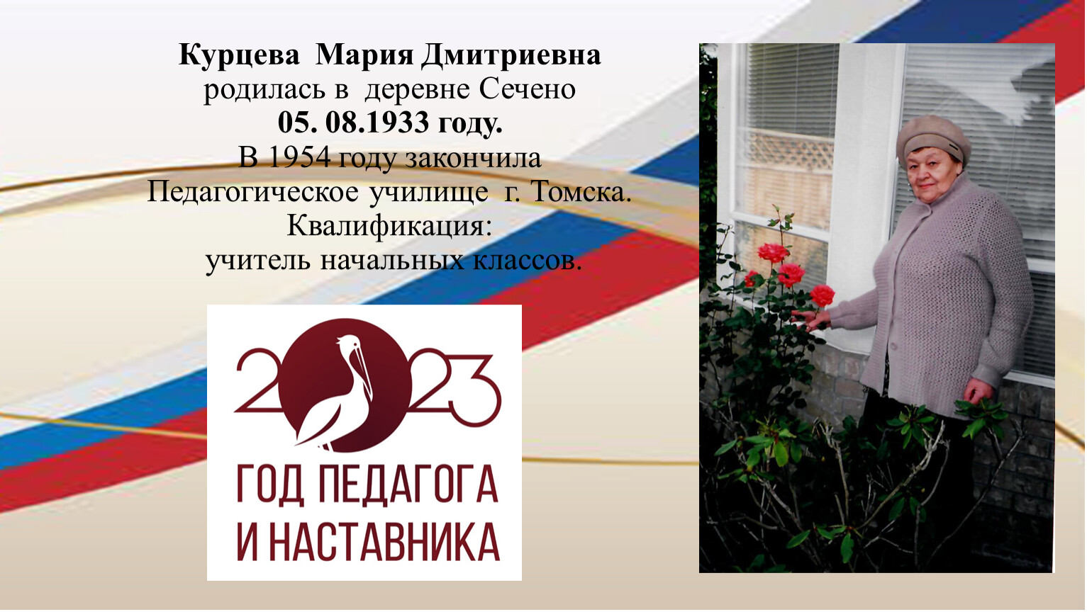 Курцева Мария Дмитриевна родилась в деревне Сечено05. 08.1933 году.В 1954 году закончила Педагогическое училище г. Томска. Квалификация: учитель начальных классов.