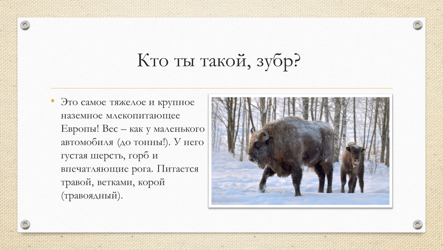 Это самое тяжелое и крупное наземное млекопитающее Европы! Вес – как у маленького автомобиля (до тонны!). У него густая шерсть, горб и впечатляющие рога. Питается травой, ветками, корой (травоядный).