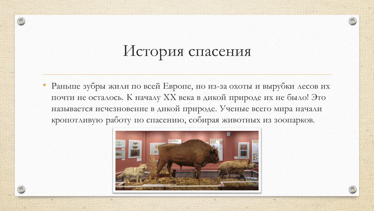 Раньше зубры жили по всей Европе, но из-за охоты и вырубки лесов их почти не осталось. К началу XX века в дикой природе их не было! Это называется исчезновение в дикой природе. Ученые всего мира начали кропотливую работу по спасению, собирая животных из зоопарков.