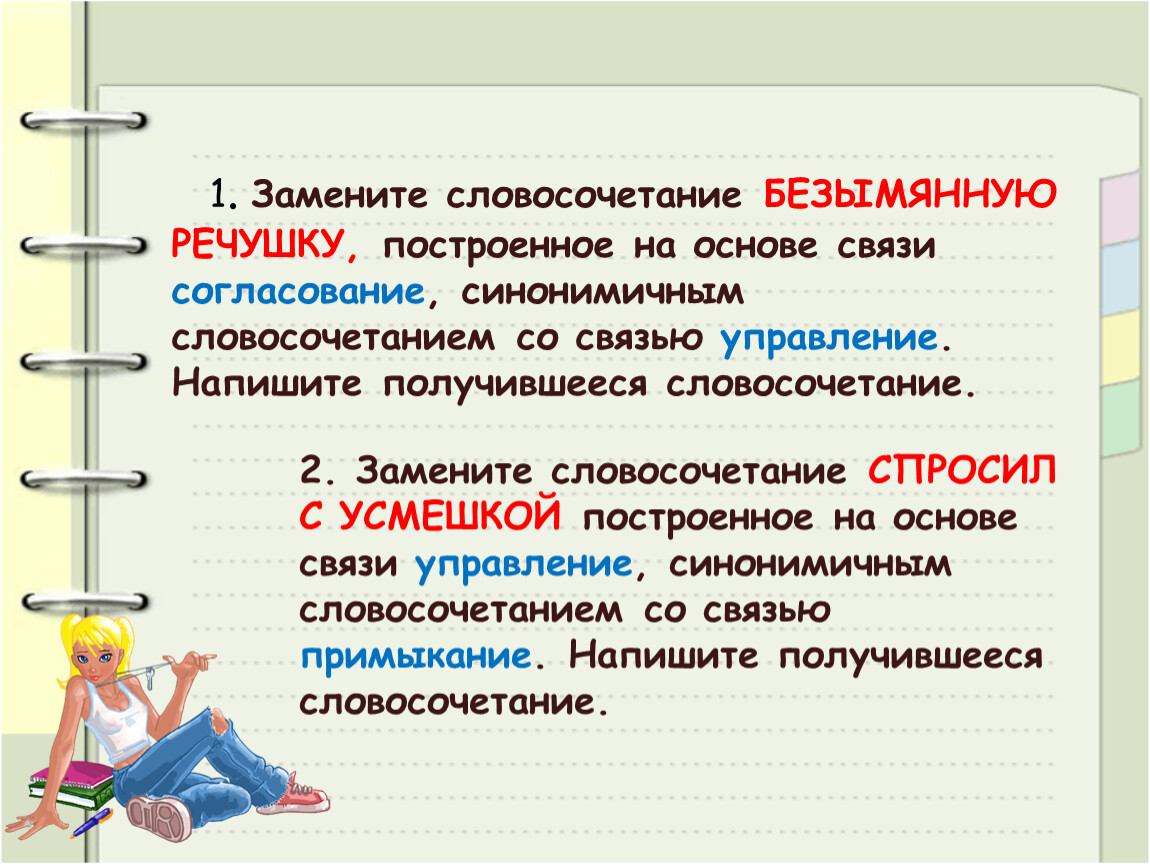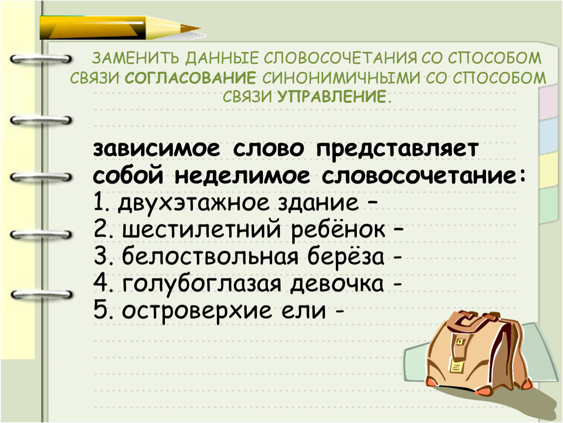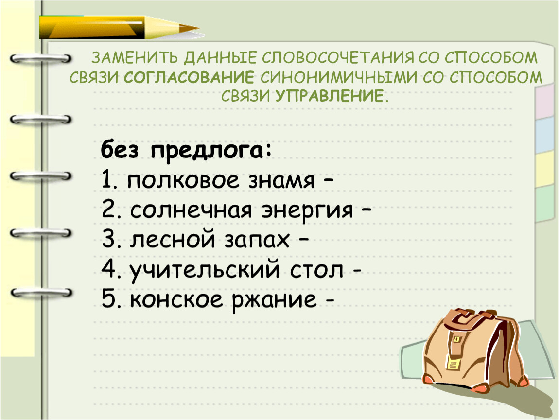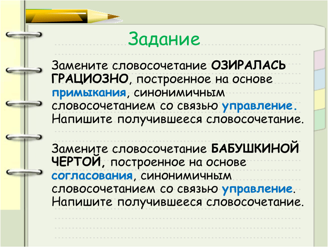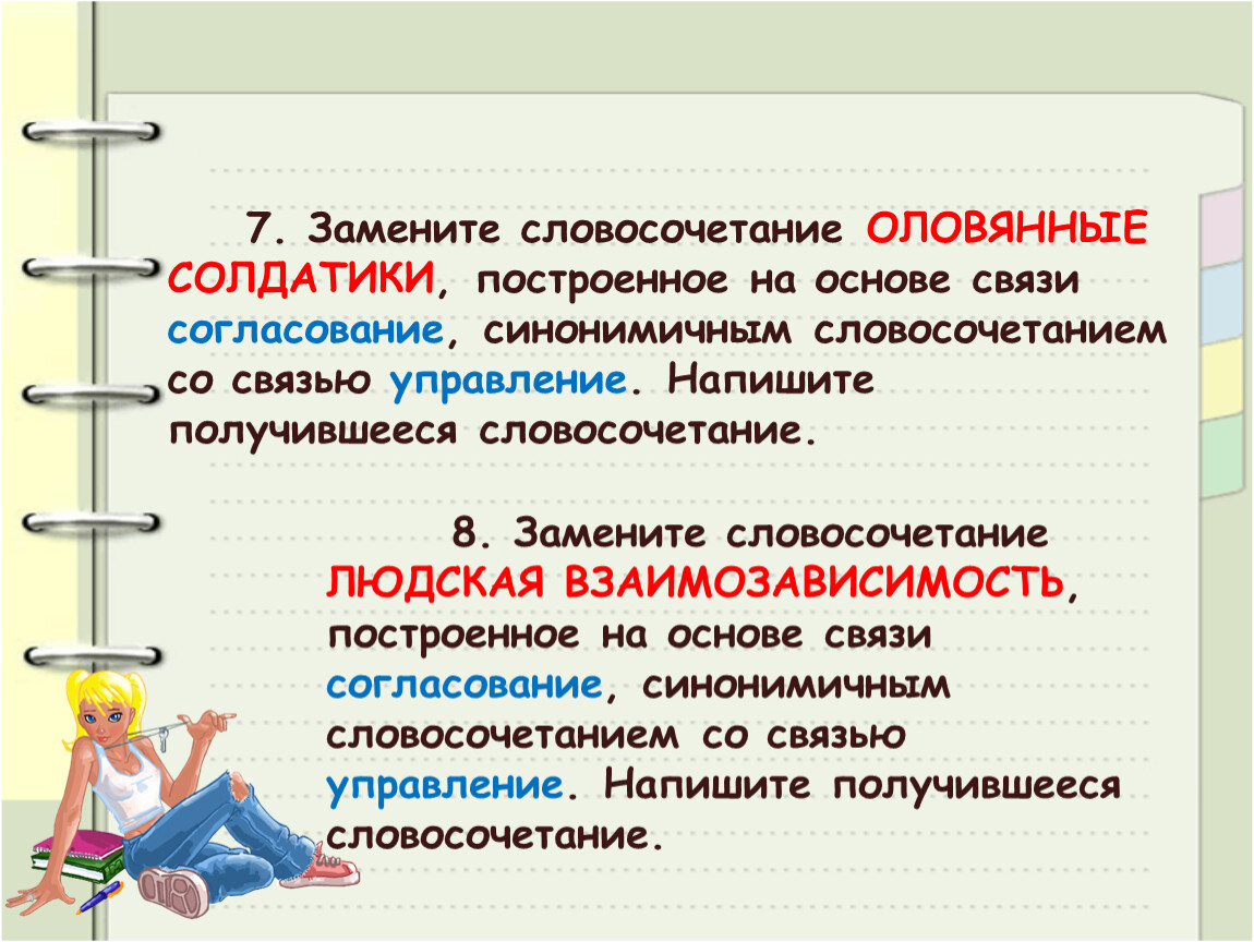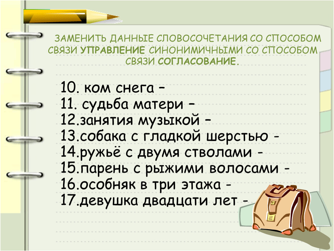 ЗАМЕНИТЬ ДАННЫЕ СЛОВОСОЧЕТАНИЯ СО СПОСОБОМ СВЯЗИ СОГЛАСОВАНИЕ СИНОНИМИЧНЫМИ СО СПОСОБОМ СВЯЗИ УПРАВЛЕНИЕ.