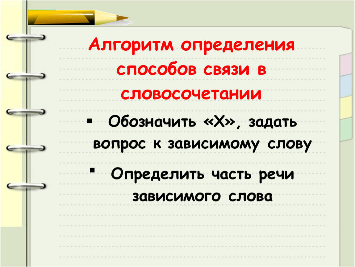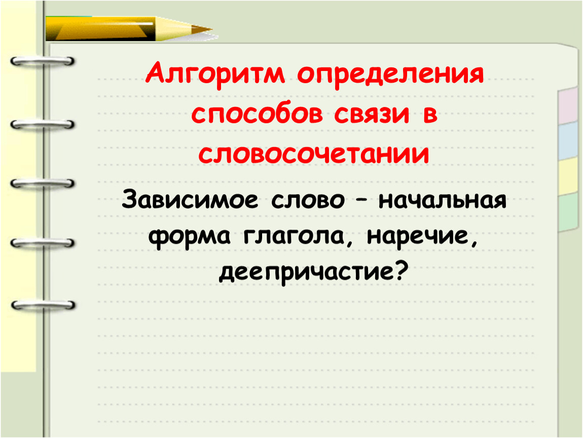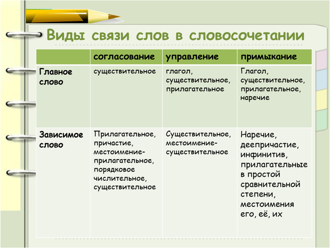 Зависимое слово | Прилагательное, причастие, местоимение-прилагательное, порядковое числительное, существительное | Существительное, местоимение-существительное | Наречие, деепричастие, инфинитив, прилагательные в простой сравнительной степени, местоимения его, её, их |