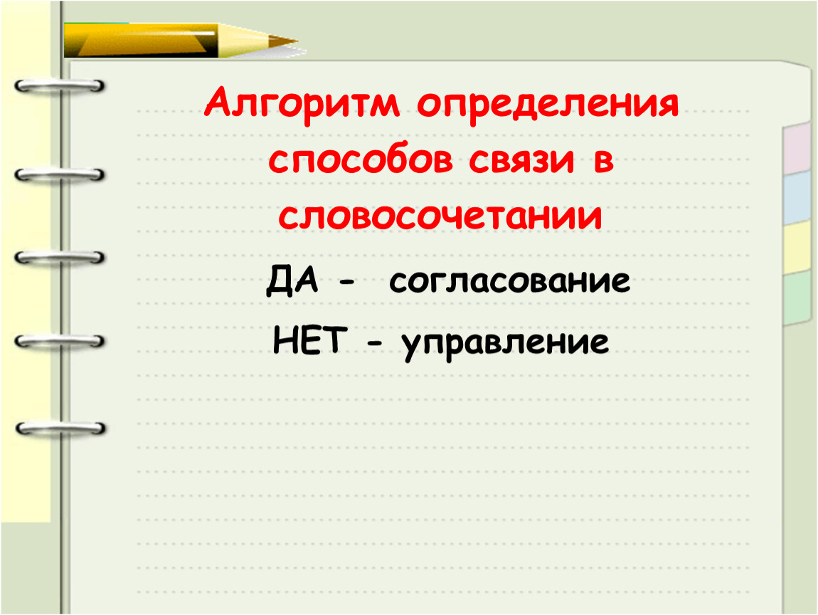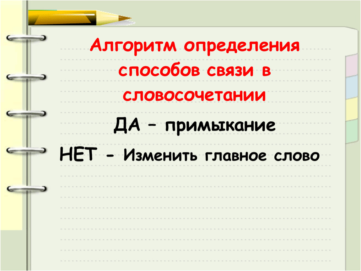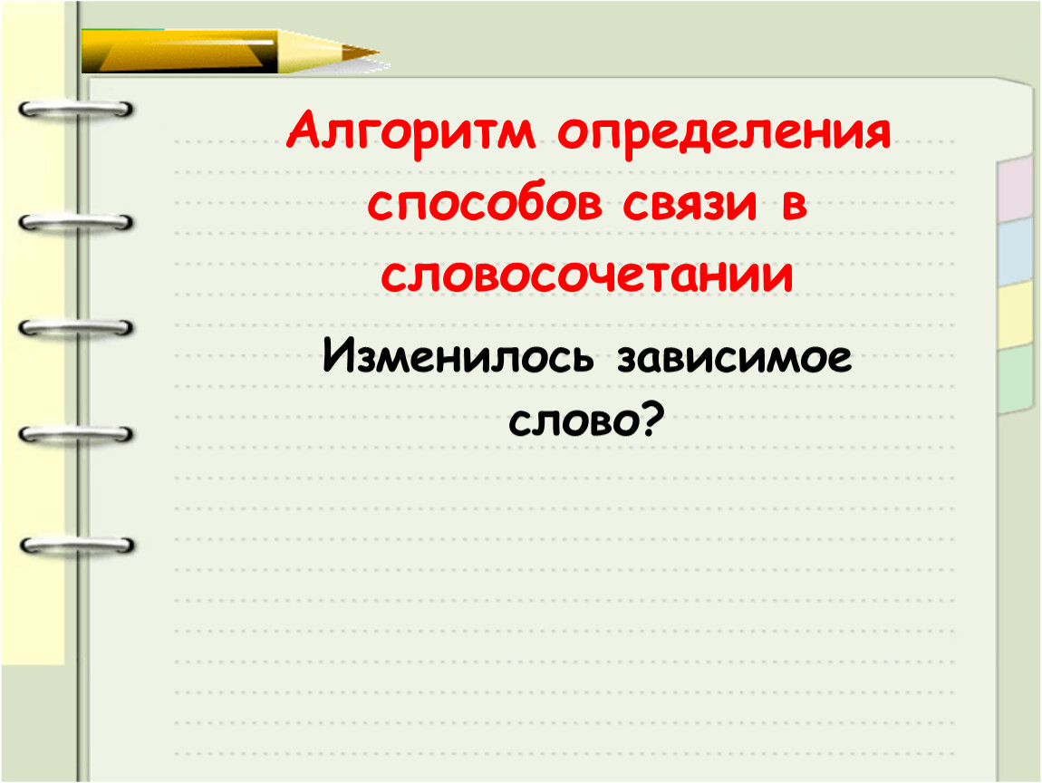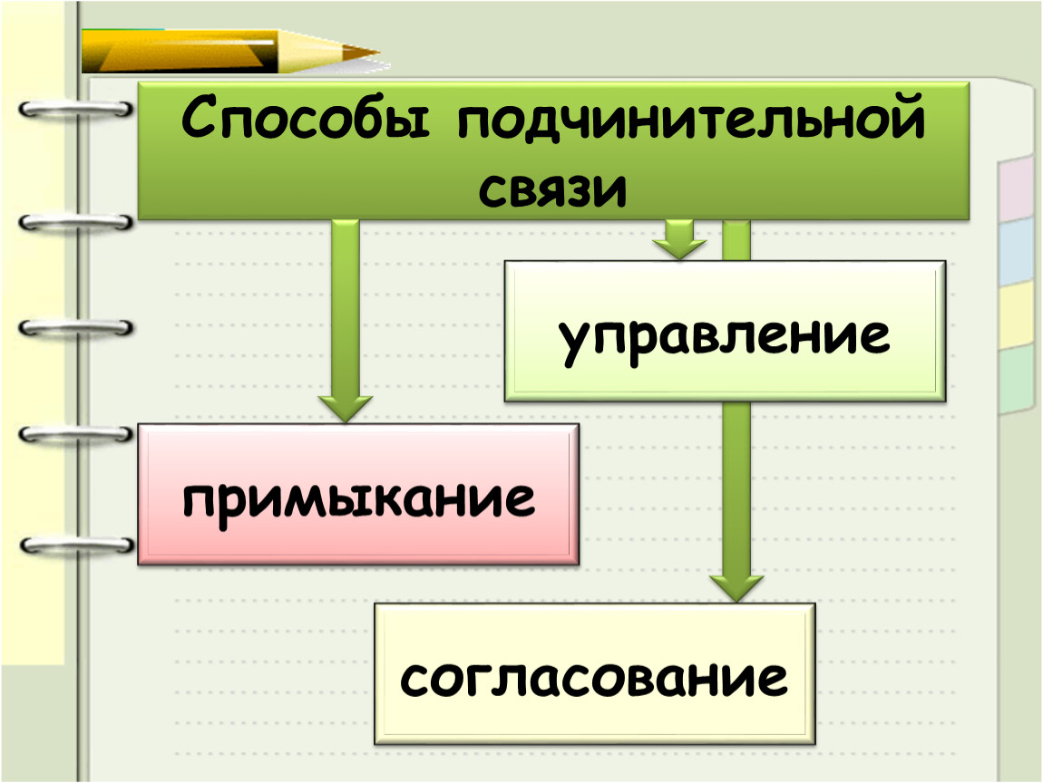 Зависимое слово | Прилагательное, причастие, местоимение-прилагательное, порядковое числительное, существительное | Существительное, местоимение-существительное | Наречие, деепричастие, инфинитив, прилагательные в простой сравнительной степени, местоимения его, её, их |