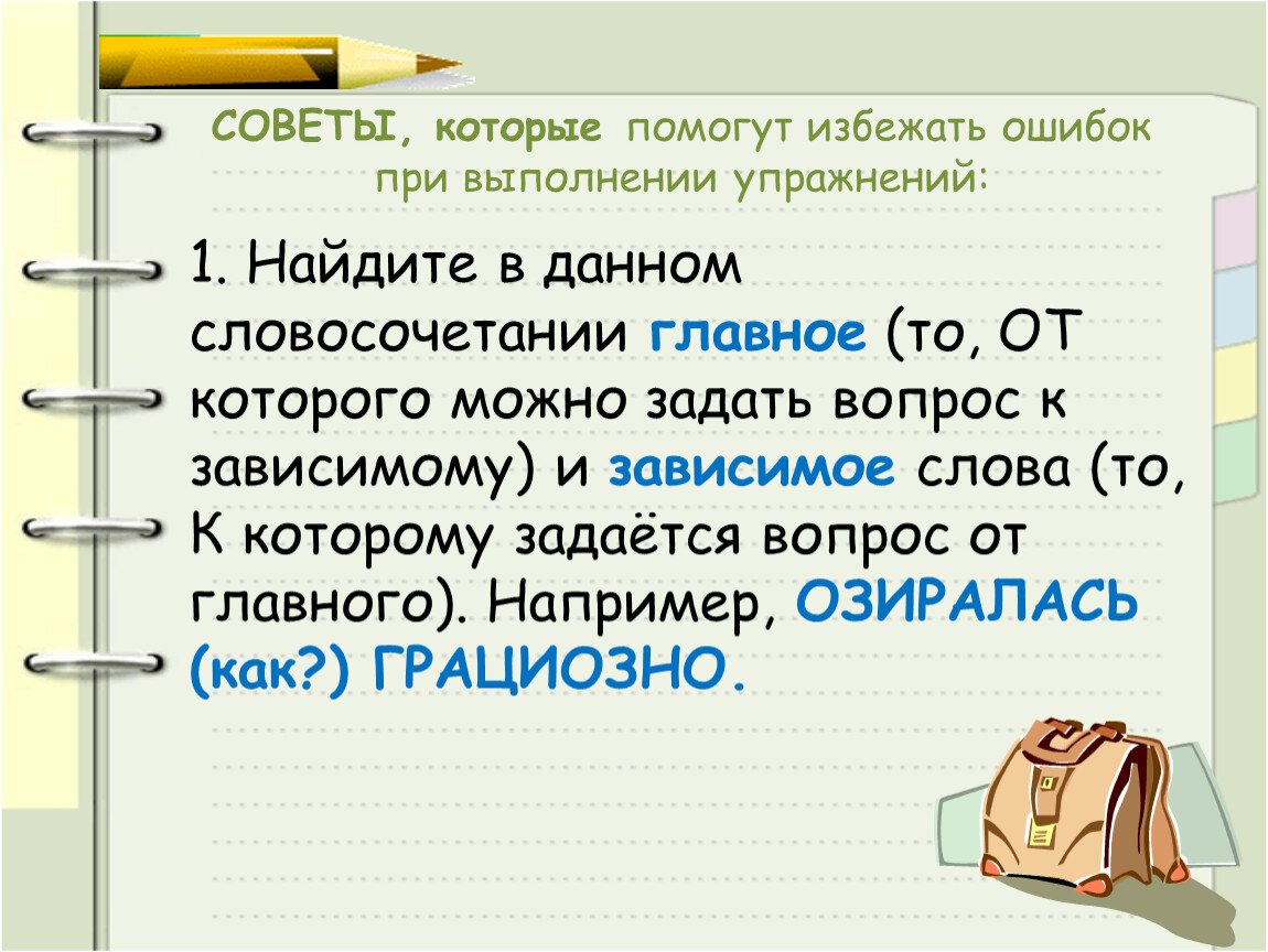 1. Найдите в данном словосочетании главное (то, ОТ которого можно задать вопрос к зависимому) и зависимое слова (то, К которому задаётся вопрос от главного). Например, ОЗИРАЛАСЬ (как?) ГРАЦИОЗНО.