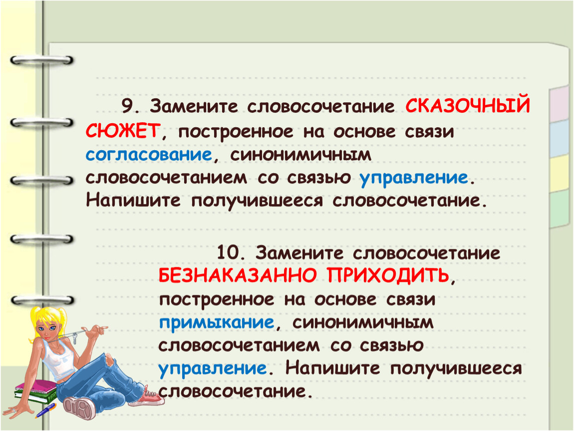 9. Замените словосочетание СКАЗОЧНЫЙ СЮЖЕТ, построенное на основе связи согласование, синонимичным словосочетанием со связью управление. Напишите получившееся словосочетание.