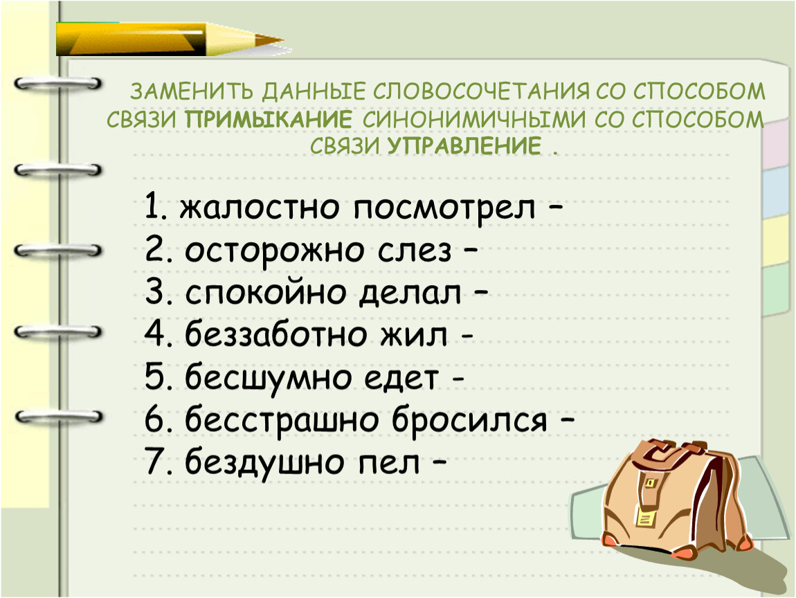 ЗАМЕНИТЬ ДАННЫЕ СЛОВОСОЧЕТАНИЯ СО СПОСОБОМ СВЯЗИ ПРИМЫКАНИЕ СИНОНИМИЧНЫМИ СО СПОСОБОМ СВЯЗИ УПРАВЛЕНИЕ .