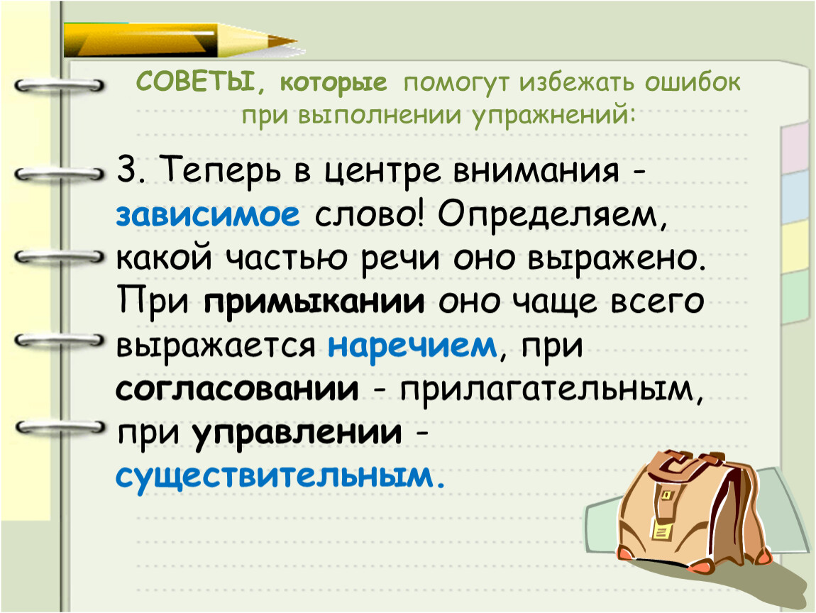 3. Теперь в центре внимания - зависимое слово! Определяем, какой частью речи оно выражено. При примыкании оно чаще всего выражается наречием, при согласовании - прилагательным, при управлении - существительным.