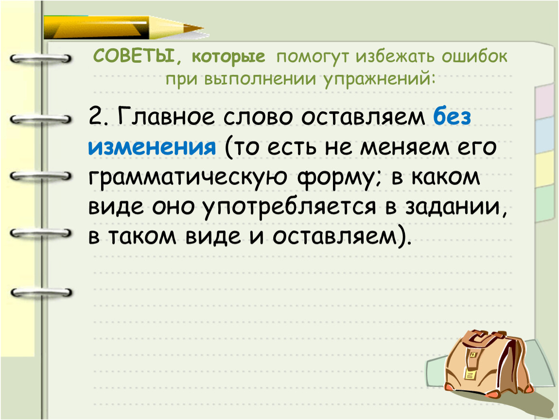 2. Главное слово оставляем без изменения (то есть не меняем его грамматическую форму; в каком виде оно употребляется в задании, в таком виде и оставляем).