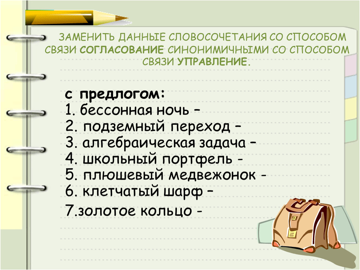 с предлогом:1. бессонная ночь – 2. подземный переход –3. алгебраическая задача – 4. школьный портфель - 5. плюшевый медвежонок - 6. клетчатый шарф –