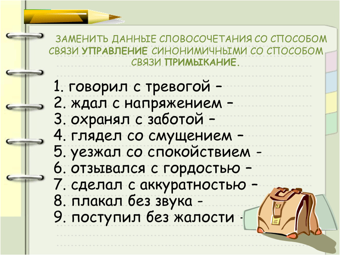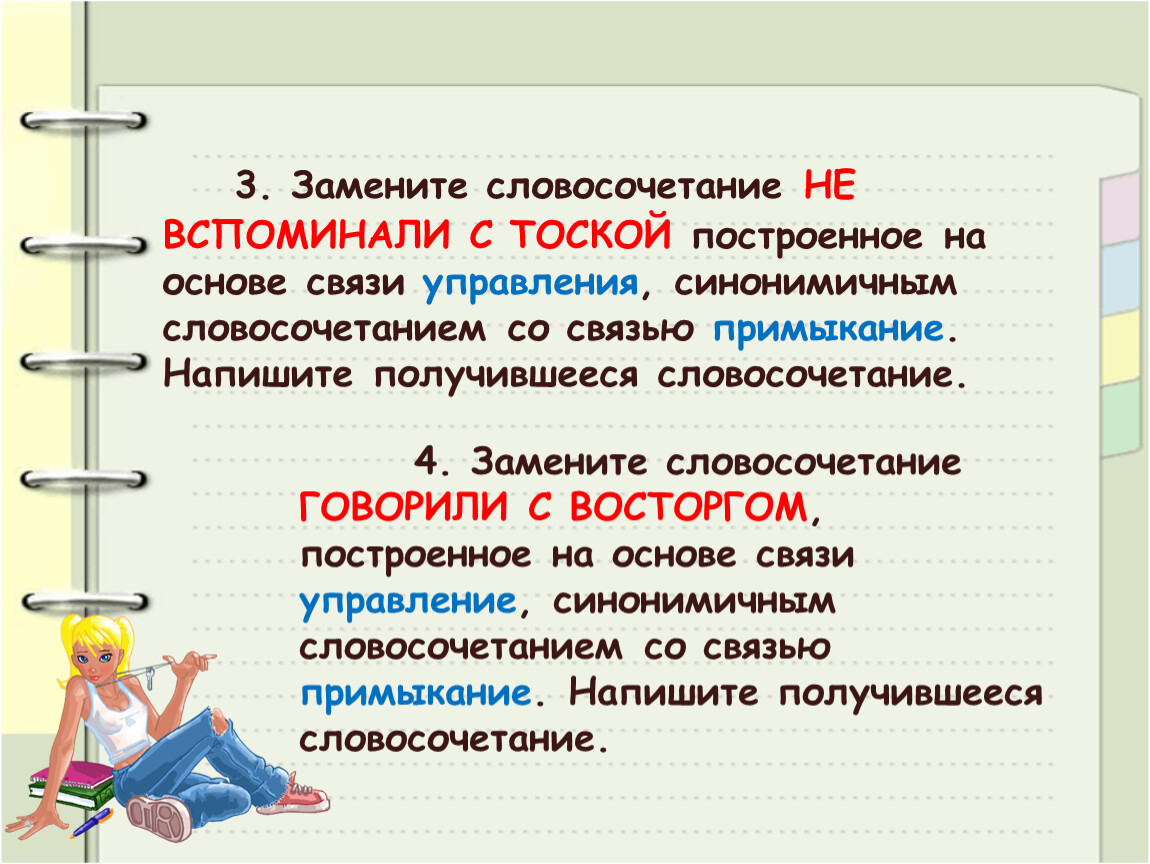 ЗАМЕНИТЬ ДАННЫЕ СЛОВОСОЧЕТАНИЯ СО СПОСОБОМ СВЯЗИ УПРАВЛЕНИЕ СИНОНИМИЧНЫМИ СО СПОСОБОМ СВЯЗИ ПРИМЫКАНИЕ.