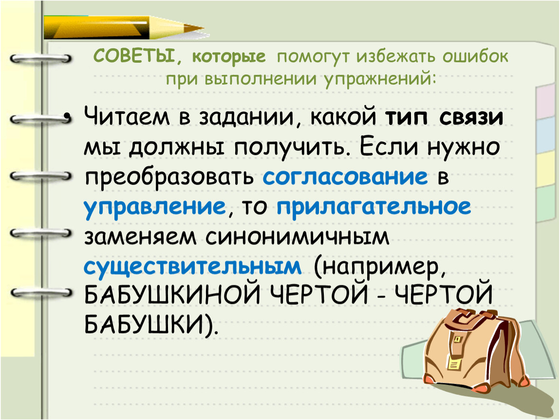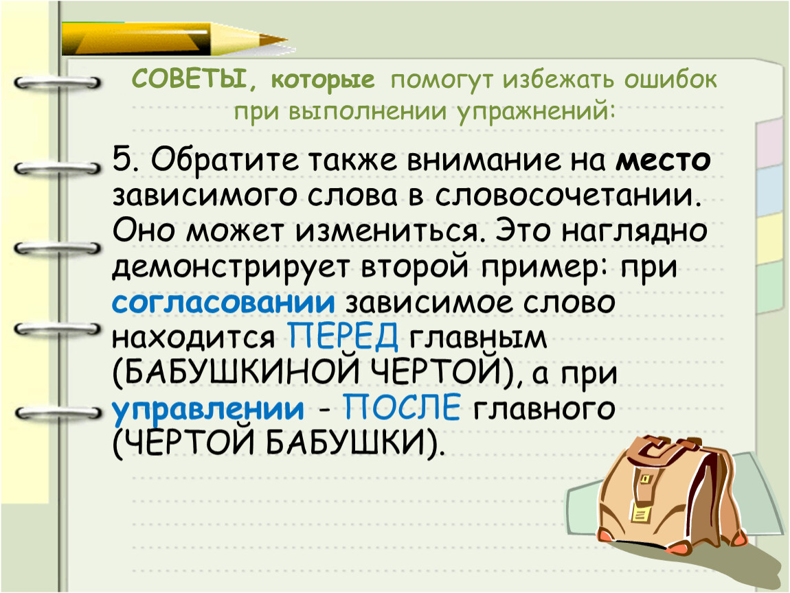 5. Обратите также внимание на место зависимого слова в словосочетании. Оно может измениться. Это наглядно демонстрирует второй пример: при согласовании зависимое слово находится ПЕРЕД главным (БАБУШКИНОЙ ЧЕРТОЙ), а при управлении - ПОСЛЕ главного (ЧЕРТОЙ БАБУШКИ).