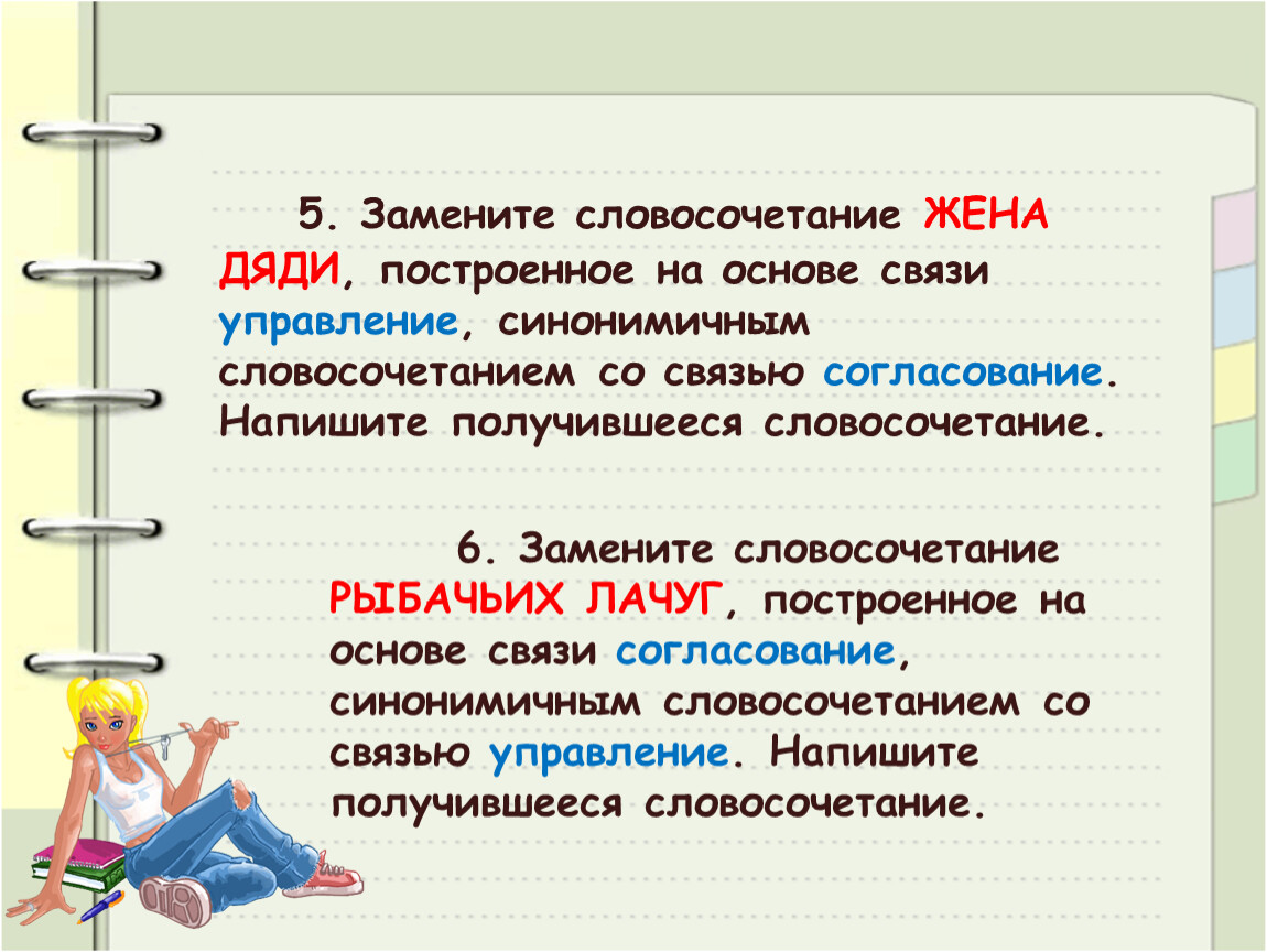 5. Замените словосочетание ЖЕНА ДЯДИ, построенное на основе связи управление, синонимичным словосочетанием со связью согласование. Напишите получившееся словосочетание.