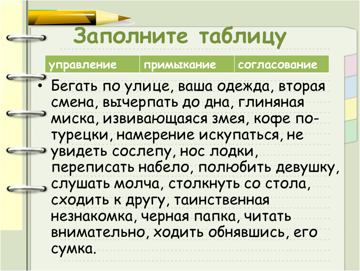 Бегать по улице, ваша одежда, вторая смена, вычерпать до дна, глиняная миска, извивающаяся змея, кофе по-турецки, намерение искупаться, не увидеть сослепу, нос лодки, переписать набело, полюбить девушку, слушать молча, столкнуть со стола, сходить к другу, таинственная незнакомка, черная папка, читать внимательно, ходить обнявшись, его сумка.