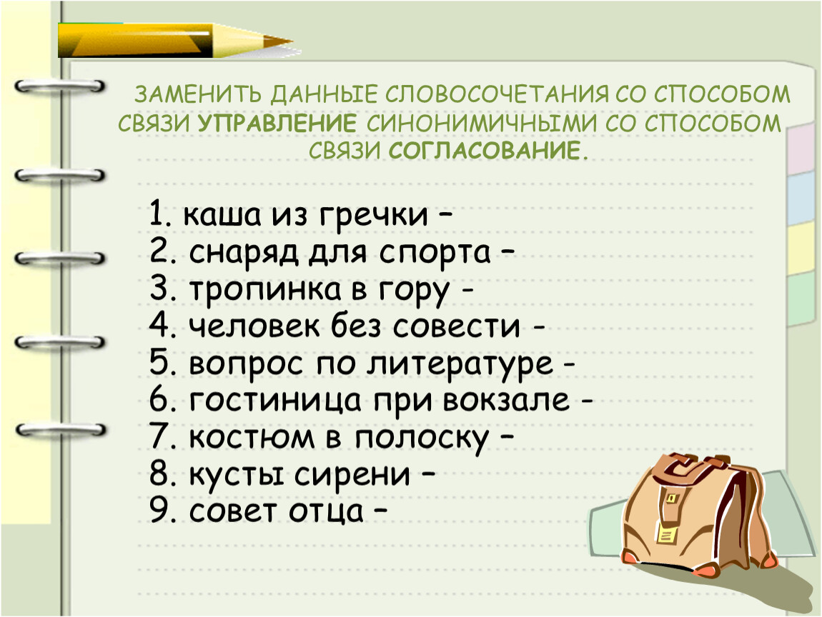 1. каша из гречки – 2. снаряд для спорта – 3. тропинка в гору - 4. человек без совести - 5. вопрос по литературе - 6. гостиница при вокзале - 7. костюм в полоску – 8. кусты сирени – 9. совет отца –