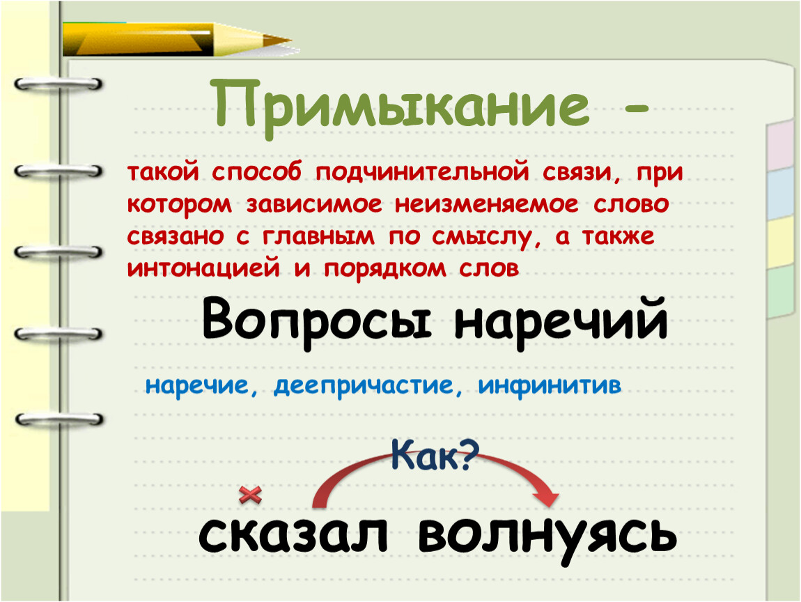 такой способ подчинительной связи, при котором зависимое неизменяемое слово связано с главным по смыслу, а также интонацией и порядком слов