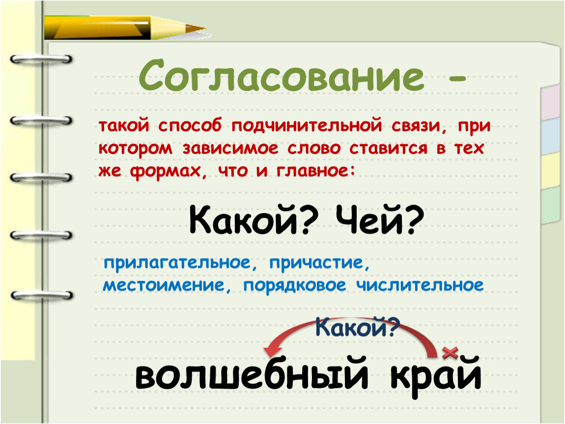 такой способ подчинительной связи, при котором зависимое слово ставится в тех же формах, что и главное: