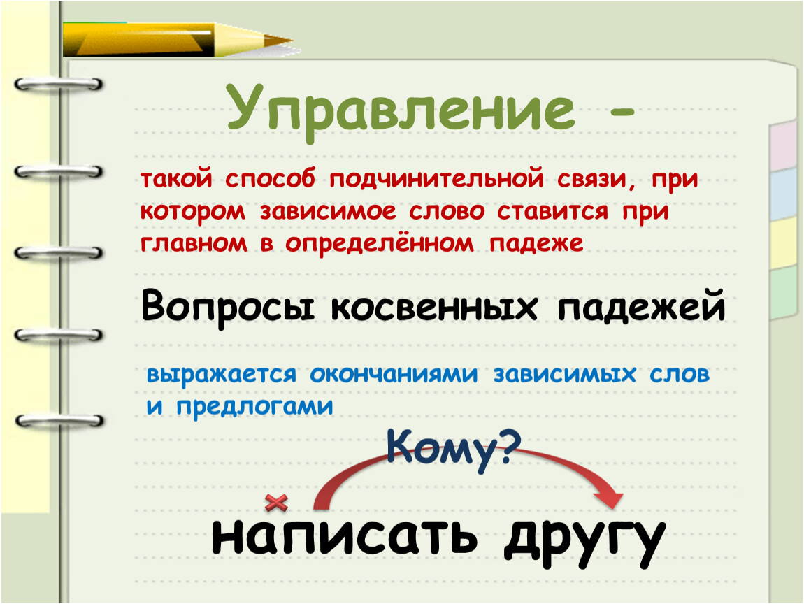 такой способ подчинительной связи, при котором зависимое слово ставится при главном в определённом падеже