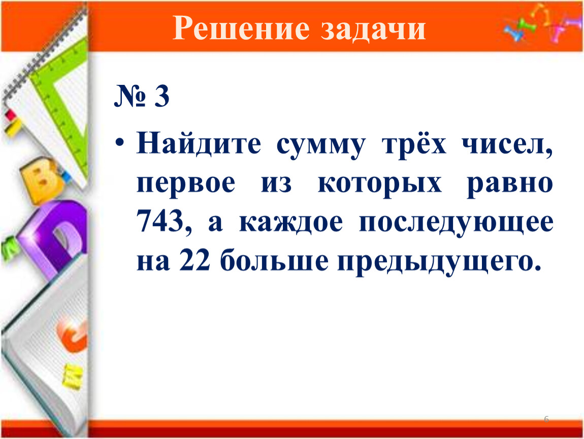 Найдите сумму трёх чисел, первое из которых равно 743, а каждое последующее на 22 больше предыдущего.