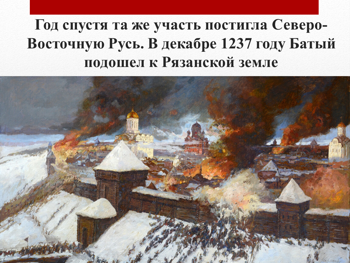 Год спустя та же участь постигла Северо-Восточную Русь. В декабре 1237 году Батый подошел к Рязанской земле