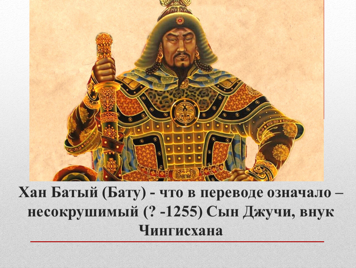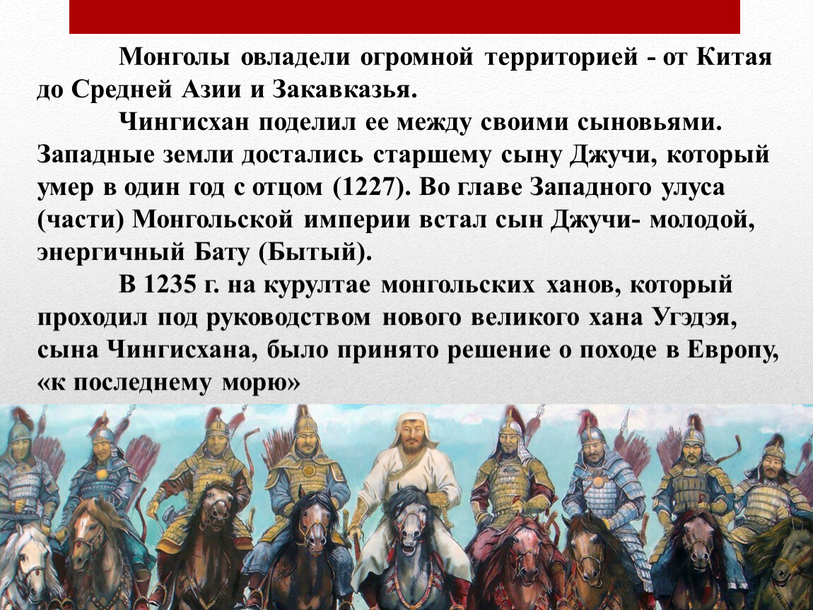 Монголы овладели огромной территорией - от Китая до Средней Азии и Закавказья. Чингисхан поделил ее между своими сыновьями. Западные земли достались старшему сыну Джучи, который умер в один год с отцом (1227). Во главе Западного улуса (части) Монгольской империи встал сын Джучи- молодой, энергичный Бату (Бытый). В 1235 г. на курултае монгольских ханов, который проходил под руководством нового великого хана Угэдэя, сына Чингисхана, было принято решение о походе в Европу, «к последнему морю»