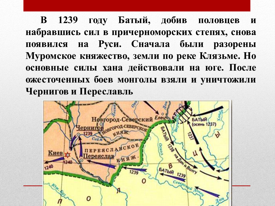 В 1239 году Батый, добив половцев и набравшись сил в причерноморских степях, снова появился на Руси. Сначала были разорены Муромское княжество, земли по реке Клязьме. Но основные силы хана действовали на юге. После ожесточенных боев монголы взяли и уничтожили Чернигов и Переславль