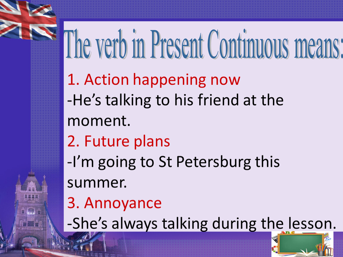 1. Action happening now-He’s talking to his friend at the moment.2. Future plans-I’m going to St Petersburg this summer.3. Annoyance-She’s always talking during the lesson.