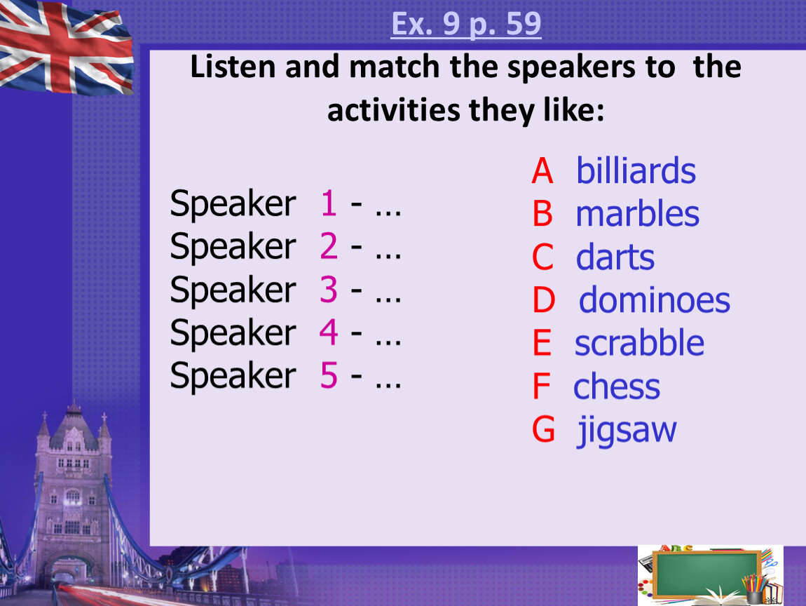 Ex. 9 p. 59Listen and match the speakers to the activities they like: