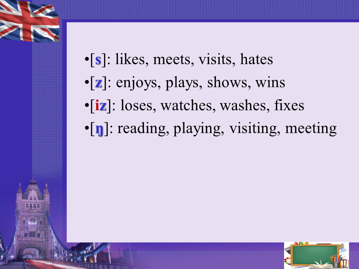 [s]: likes, meets, visits, hates