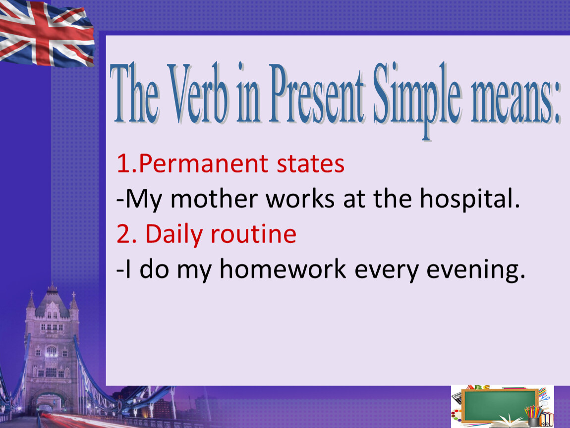 1.Permanent states-My mother works at the hospital.2. Daily routine-I do my homework every evening.