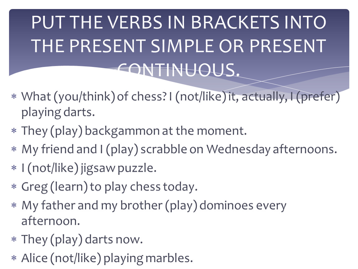 What (you/think) of chess? I (not/like) it, actually, I (prefer) playing darts.