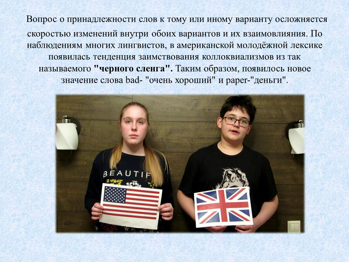 Вопрос о принадлежности слов к тому или иному варианту осложняется скоростью изменений внутри обоих вариантов и их взаимовлияния. По наблюдениям многих лингвистов, в американской молодёжной лексике появилась тенденция заимствования коллоквиализмов из так называемого "черного сленга". Таким образом, появилось новое значение слова bad- "очень хороший" и paper-"деньги".