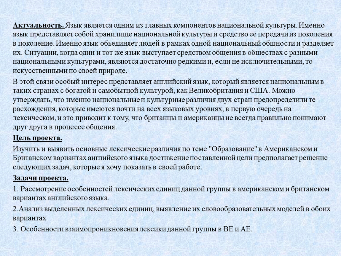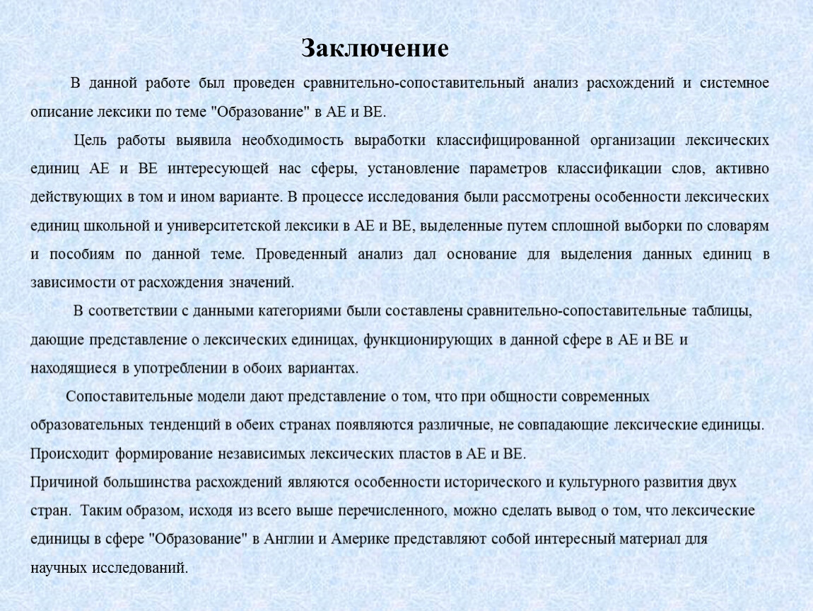 В данной работе был проведен сравнительно-сопоставительный анализ расхождений и системное описание лексики по теме "Образование" в АЕ и ВЕ.