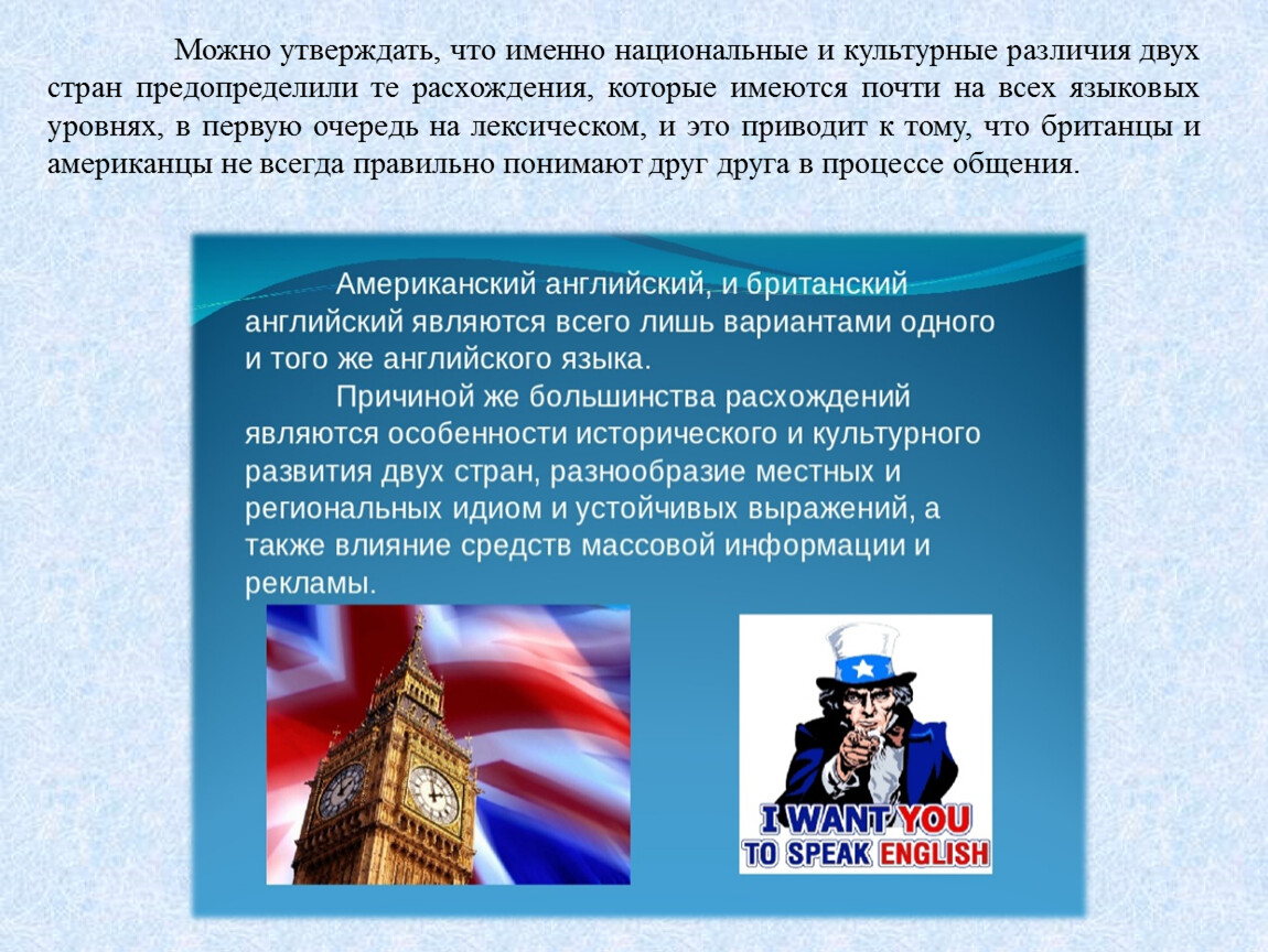 Можно утверждать, что именно национальные и культурные различия двух стран предопределили те расхождения, которые имеются почти на всех языковых уровнях, в первую очередь на лексическом, и это приводит к тому, что британцы и американцы не всегда правильно понимают друг друга в процессе общения.