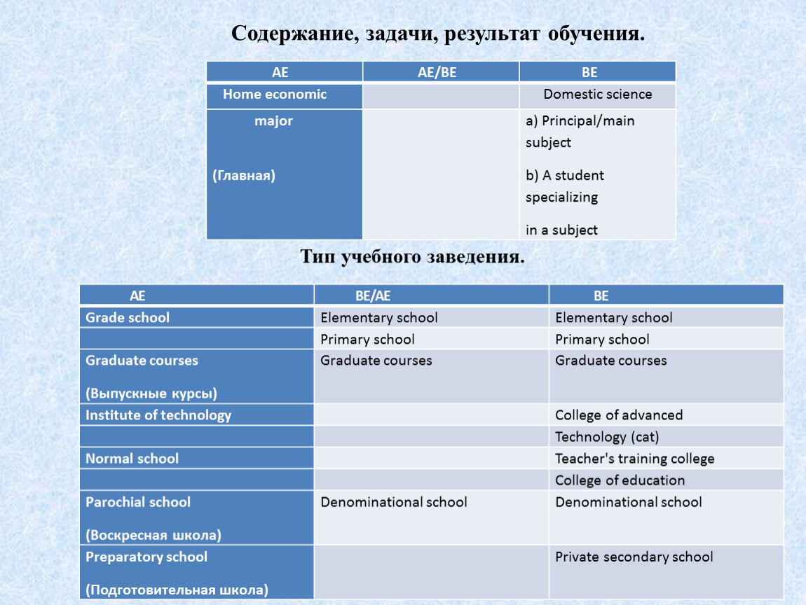 Сравнительно-сопоставительный анализ лексики BE и AE в выделенных семантических подгруппах. Существуют различия в двух национальных вариантах английского языка, проявляющиеся и в лексике, входящей в сферу "Образование". Исследования групп и подсистем лексики с общей предметно-понятийной мерой отношения имеет значительную традицию в языкознании. Получены классификации лексики по темам, понятиям, сферам экстралингвистической отнесенности положен в основу многих лексикологических и методических пособий, а также идеографических словарей, тезаурусов, получивших широкое распространение в последний годы.