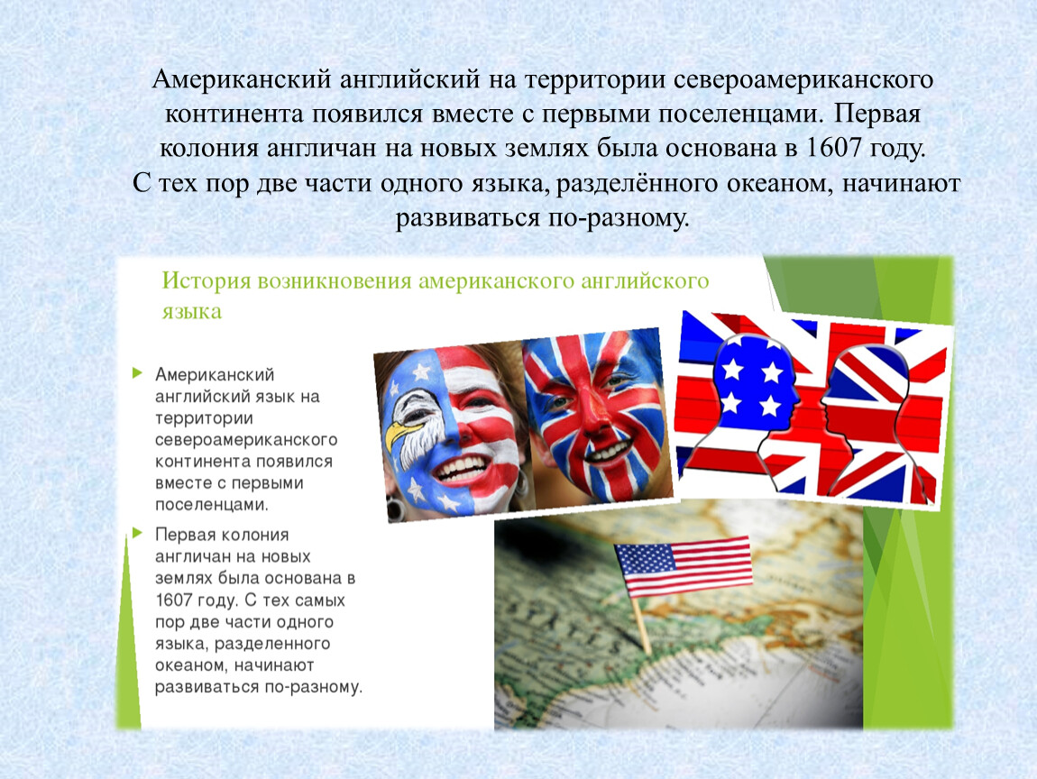 Американский английский на территории североамериканского континента появился вместе с первыми поселенцами. Первая колония англичан на новых землях была основана в 1607 году. С тех пор две части одного языка, разделённого океаном, начинают развиваться по-разному.