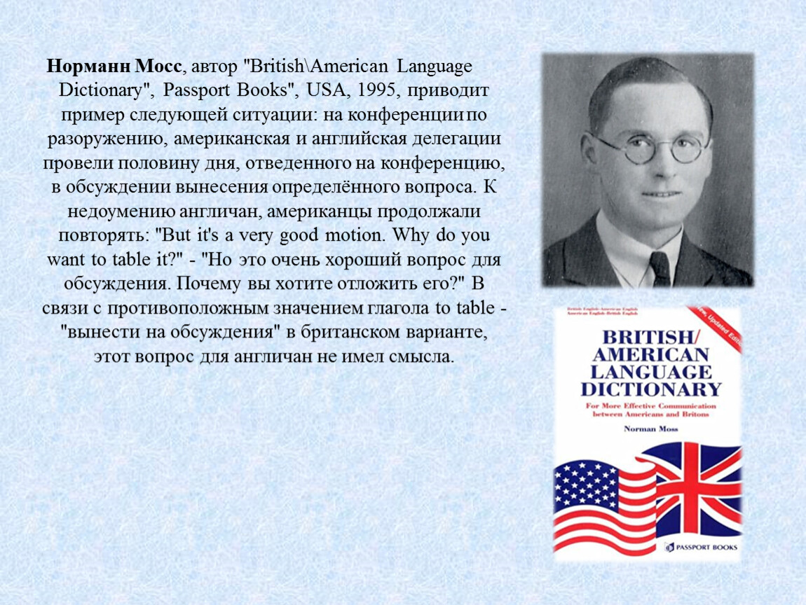 Норманн Мосс, автор "British\American Language Dictionary", Passport Books", USA, 1995, приводит пример следующей ситуации: на конференции по разоружению, американская и английская делегации провели половину дня, отведенного на конференцию, в обсуждении вынесения определённого вопроса. К недоумению англичан, американцы продолжали повторять: "But it's a very good motion. Why do you want to table it?" - "Но это очень хороший вопрос для обсуждения. Почему вы хотите отложить его?" В связи с противоположным значением глагола to table - "вынести на обсуждения" в британском варианте, этот вопрос для англичан не имел смысла.