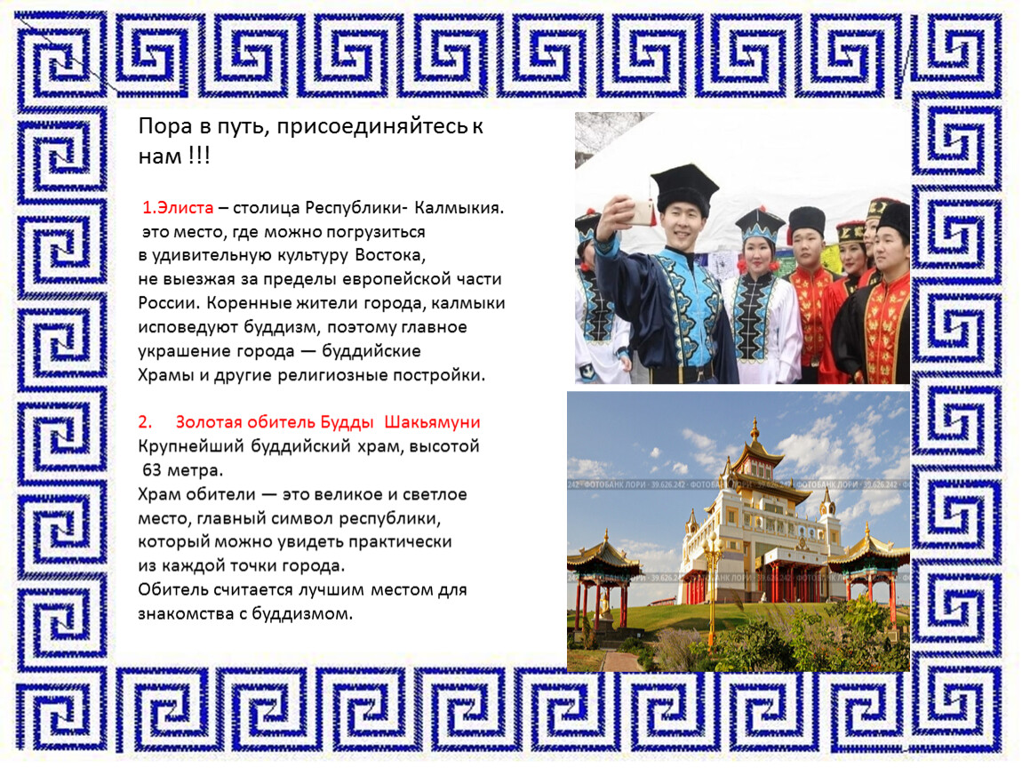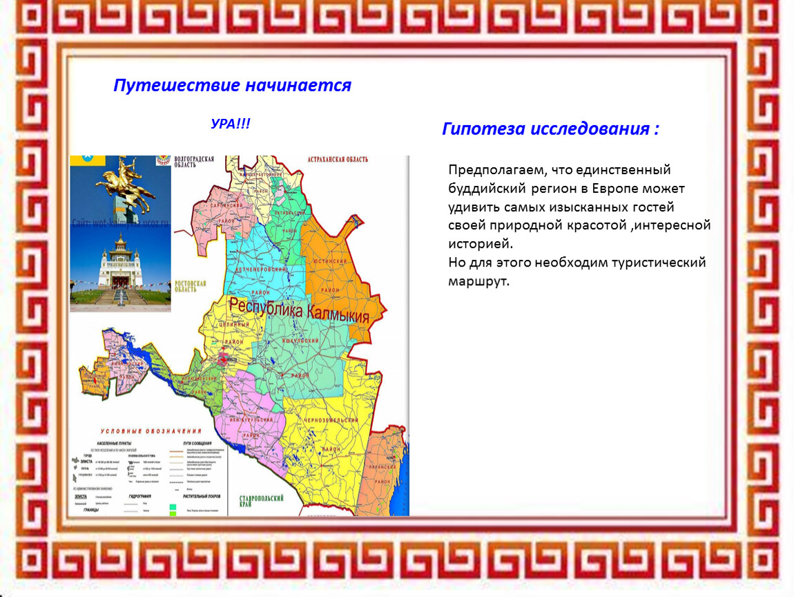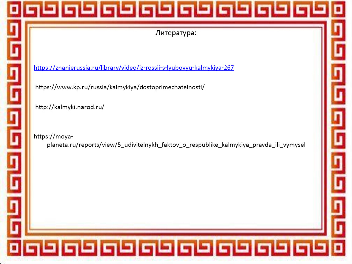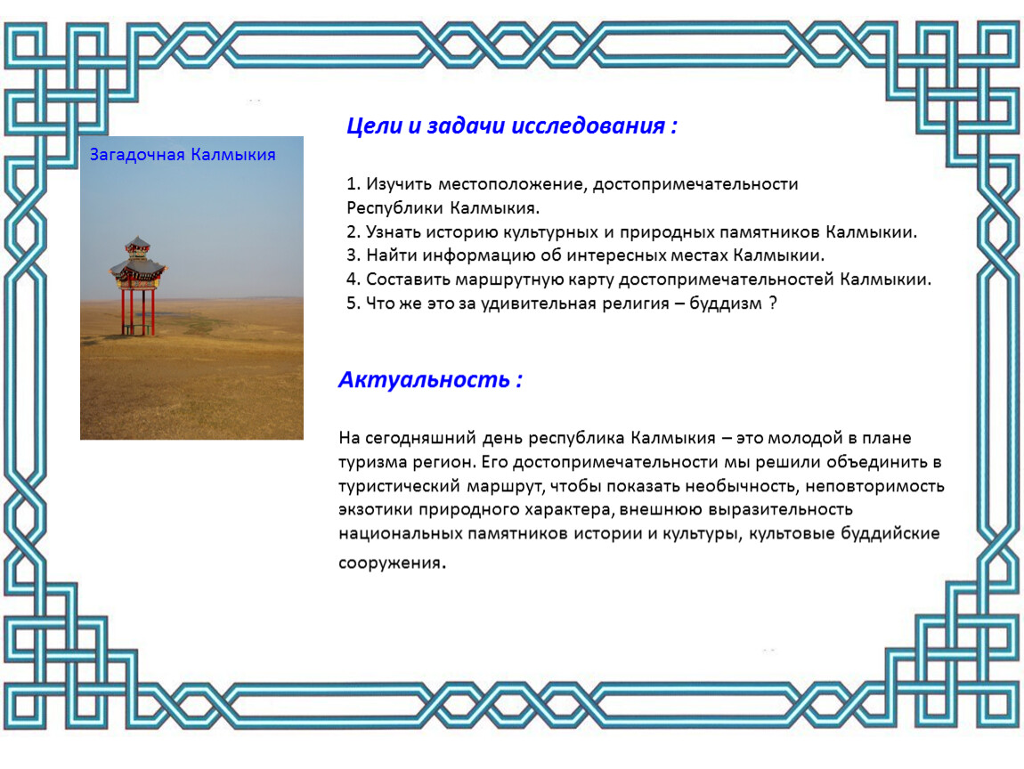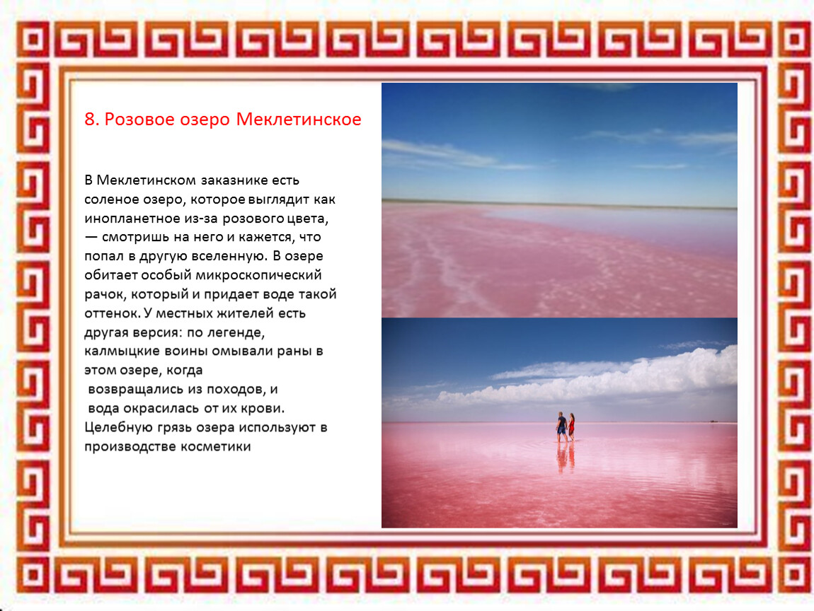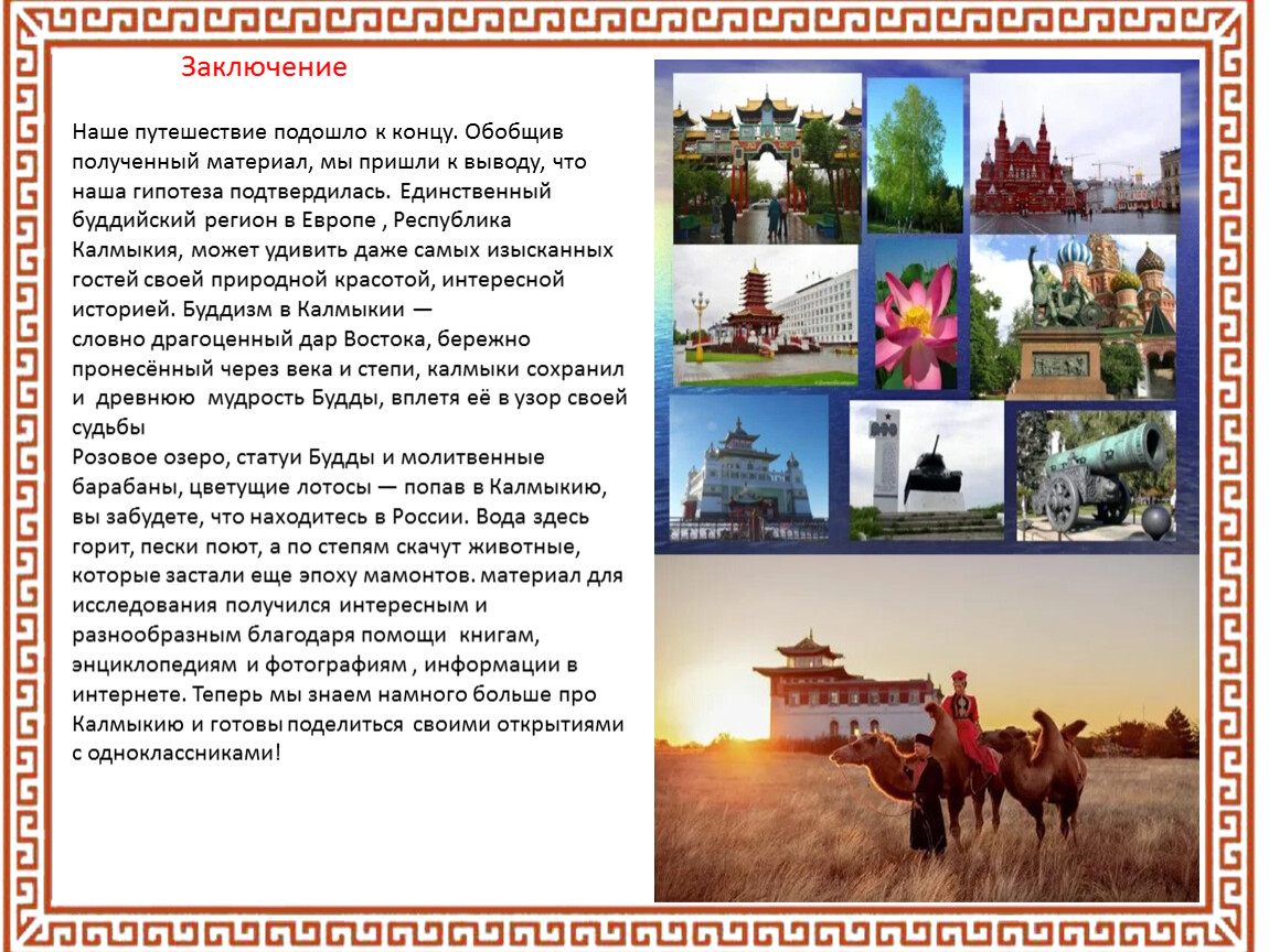 Розовое озеро, статуи Будды и молитвенные барабаны, цветущие лотосы — попав в Калмыкию, вы забудете, что находитесь в России. Вода здесь горит, пески поют, а по степям скачут животные, которые застали еще эпоху мамонтов. материал для исследования получился интересным и разнообразным благодаря помощи книгам, энциклопедиям и фотографиям , информации в интернете. Теперь мы знаем намного больше про Калмыкию и готовы поделиться своими открытиями с одноклассниками!