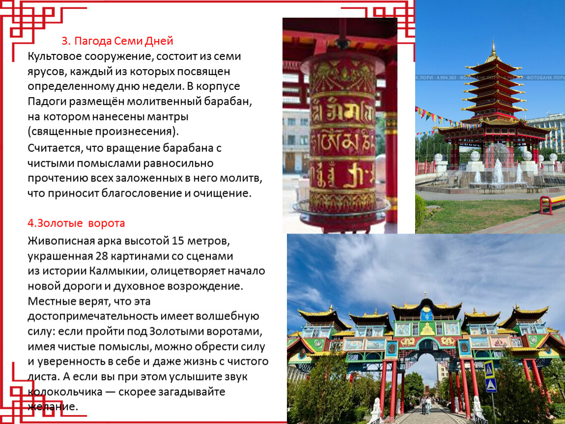 Живописная арка высотой 15 метров, украшенная 28 картинами со сценами из истории Калмыкии, олицетворяет начало новой дороги и духовное возрождение. Местные верят, что эта достопримечательность имеет волшебную силу: если пройти под Золотыми воротами, имея чистые помыслы, можно обрести силу и уверенность в себе и даже жизнь с чистого листа. А если вы при этом услышите звук колокольчика — скорее загадывайте желание.