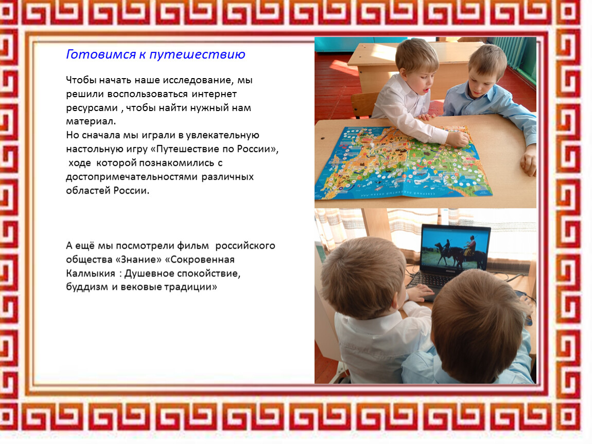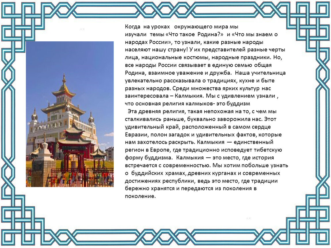 Когда на уроках окружающего мира мы изучали темы «Что такое Родина?» и «Что мы знаем о народах России», то узнали, какие разные народы населяют нашу страну! У их представителей разные черты лица, национальные костюмы, народные праздники. Но, все народы России связывает в единую семью общая Родина, взаимное уважение и дружба. Наша учительница увлекательно рассказывала о традициях, кухне и быте разных народов. Среди множества ярких культур нас заинтересовала – Калмыкия. Мы с удивлением узнали , что основная религия калмыков- это буддизм